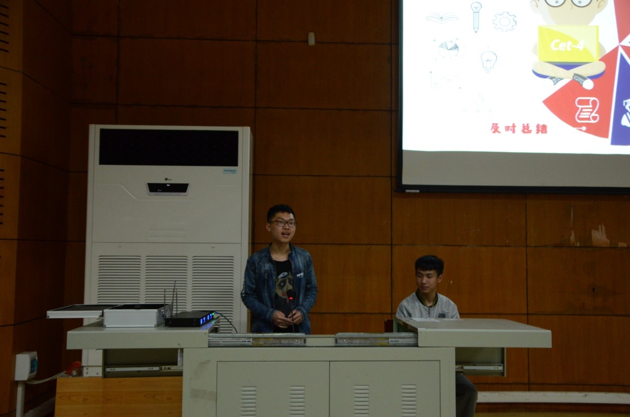 表彰过后,地信1602班曹书浩作为优秀员工代表分享了备考经验。他建议同学们有自己的备考计划、重视四级模拟、准备专用笔记本、跟着老师的教学思路走和及时总结。在听力、阅读、写作和翻译四个方面,曹书浩都详细地介绍了自己的训练方法并提醒同学一些细节,如“听力前的试音阶段就要进入状态,不要等试音结束才开始好好听”、“要从现在开始记一些专有名词”以及“写作时用更高级的连接词”等等。