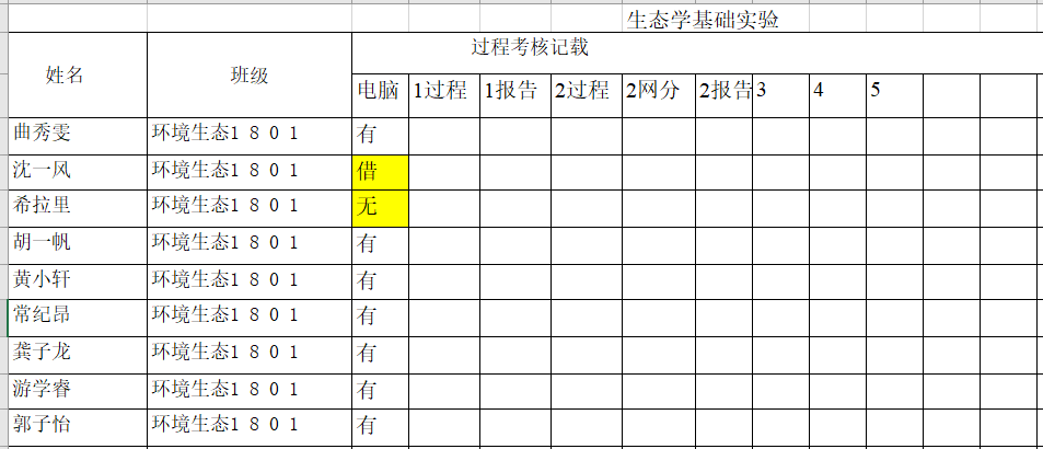 生态学基础实验为考察课程,注重过程考核的记载,针对不同实验,过程考核方式有差异,见下表,主要由员工在课堂的互动讨论,网上课程分数,实验报告等组成。每次课堂进行详细记录。
