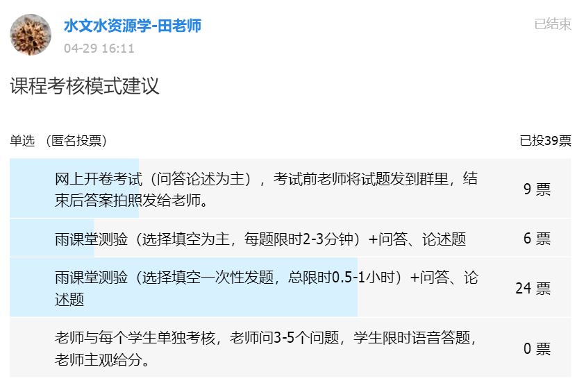 (3)尊重员工意愿,多种方式考核员工学习情况:课程选择平时成绩+课程论文+网上开卷考试综合考核模式,避免单一考核模式不公平的问题;提前模拟网上考试,并及时征集员工意见,通过网络投票最终确定雨课堂测验方式来开展期末理论考核。
