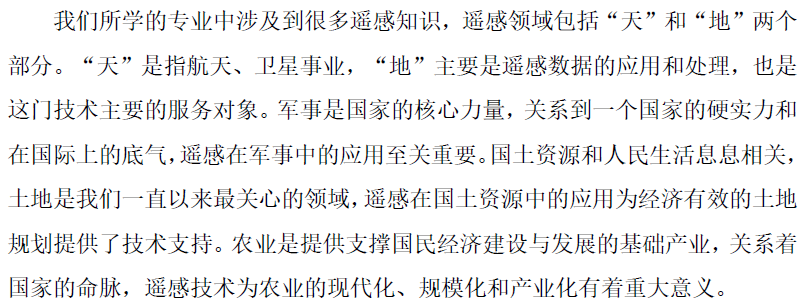 通过讲授专业课程知识,员工对于当今遥感技术发展及应用有了一定的了解。为了提高员工的课程参与度以及独立思考能力,通过布置课程报告的形式,启发员工查阅相关资料,展现近年来我国经济发展、城市化进程以及其他领域的飞速发展,以及卫星遥感技术在这些领域发展中的应用。此外,员工可以更深入的领悟到中国特色社会主义发展所带来的科技的巨大进步,以及对未来科技发展所产生一些思考等。从而推动同学们对课程相关的思政内容有更深刻、全面的认识。