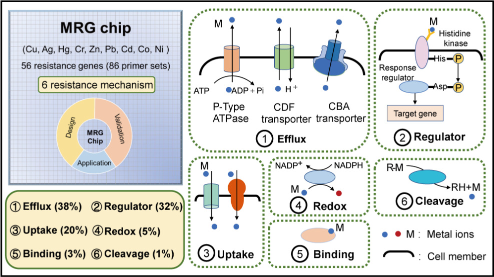 重金属抗性机制在帮助微生物抵抗重金属毒性的同时,也驱动了金属的生物地球化学循环。由于环境微生物重金属抗性基因复杂多样,在微生物群落水平对多种重金属抗性基因进行定量分析难度较大。本研究基于高通量qPCR技术开发了一种重金属抗性基因芯片(MRG Chip),用于微生物重金属核心抗性组研究。MRG芯片可对9种重金属(铜、银、汞、铬、锌、铅、镉、钴、镍)的56个抗性基因进行高通量定量检测,具有高效、快速、准确、灵敏度高、特异性强、覆盖范围广等特点。MRG芯片共覆盖29门382属的微生物类群,>94%的引物扩增效率为80-110%,可在3小时内完成54个样品的重金属抗性组定量分析,目前已成功运用在土壤、沉积物、灰尘、粪便等环境样品重金属抗性组的检测。MRG芯片的研发为表征环境微生物重金属抗性组提供了有利的高通量检测手段,未来有望在重金属抗性组特征及环境驱动因素等相关研究中发挥重要作用。