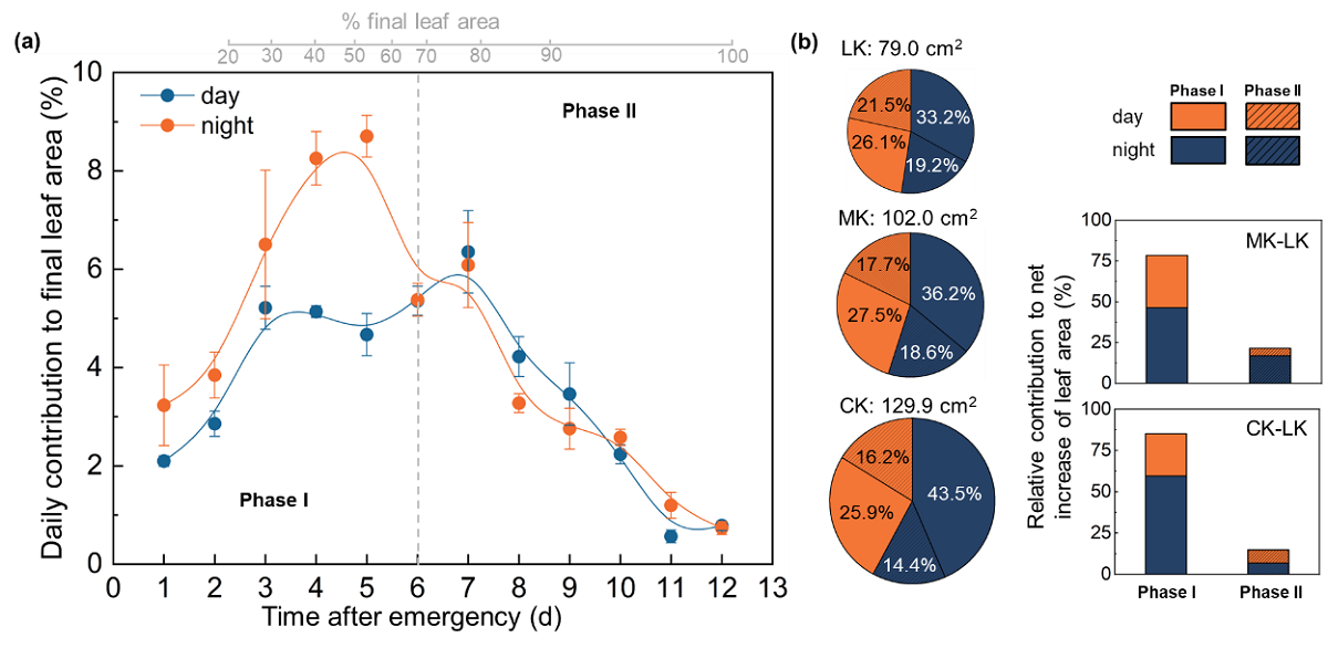 进一步研究了不同钾营养条件下油菜叶片昼夜生长特征、同化物合成和水力学特性等,结果发现钾素营养主要通过调控夜间叶片生长来影响叶面积(>60%),且集中在叶片由库向源转换之前(叶片面积达到2/3总面积)。夜间植物蒸腾耗水量低,根压作用使植物细胞水分充盈,充足的钾营养保证了白天叶片较高的光合固碳效率和碳储量,同时促进了成熟叶片碳水化合物往新叶的输出,从而保证了夜间叶片生长充足的碳源。白天,植物维持气孔开放以尽可能多的固定空气中的CO2,但同时散失了大量的水分。适宜的钾供应提升叶片水分供应效率的同时增加了叶肉细胞渗透调节物质浓度(钾离子和碳水化合物),从而保证了白天叶片的生长。研究揭示了钾营养状况通过影响叶片光合产物的合成和水分运输,调控叶片昼夜节律生长的生理机制。