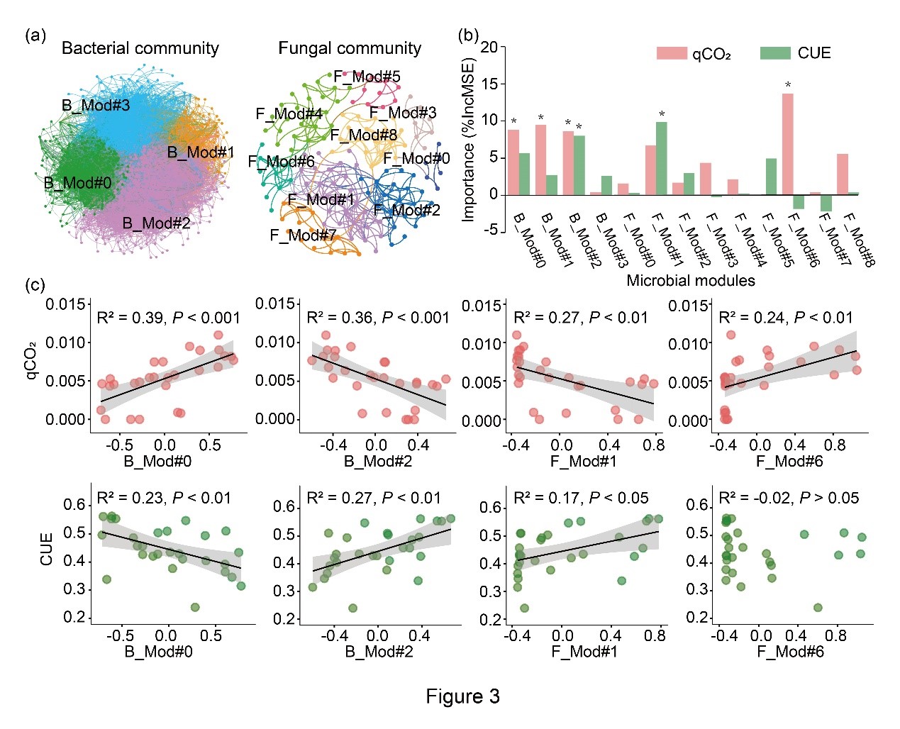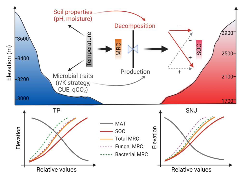 基于此,以青藏高原和神农架两个典型山地生态系统为研究对象,探究了海拔梯度下土壤微生物残体碳(合成)和代谢过程的变化及其对土壤碳固存的影响。发现海拔梯度下,微生物残体碳与有机碳含量呈正相关,是土壤有机碳的重要组成部分(Zeng et al., 2022, Global Change Biology)。此外,土壤微生物残体碳与海拔及其驱动的温度变化显著相关,表明温度升高可能降低微生物残体碳,进而减少土壤有机碳的储存。结果也表明,未来气候变暖可能通过增加微生物残体碳的降解来减少土壤碳固存,从而加剧温度升高与二氧化碳释放之间的正反馈 (图1)。研究人员也分析了海拔梯度下土壤呼吸(分解)对温度变化的响应特征及其影响因素。结果表明,土壤呼吸温度敏感性随海拔升高而增加,这与微生物生态簇从降解易分解碳逐渐转变为降解难分解碳有关 (Zeng et al., 2022)。此外,为了深入认识微生物合成代谢和分解代谢的权衡过程,基于微生物性状来探究海拔梯度下土壤微生物代谢效率特征。结果表明,微生物代谢效率随海拔升高而降低,是具有特定性状策略的微生物类群逐渐适应寒冷环境并增加获取养分投资的结果 (Feng et al., 2022; ISME Communications,图2)。以上系列研究揭示了重要的高山生态系统土壤碳周转机制,为深入认识微生物介导的土壤碳循环过程具有重要的意义。