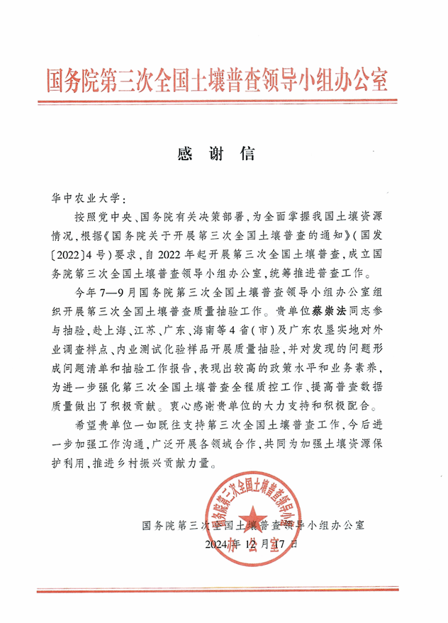 全国土壤普查办向公司蔡崇法教授致感谢信