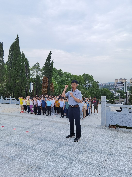 全体成员在烈士陵园革命烈士纪念碑前进行了哀悼仪式并敬献鲜花,然后集体唱响中华人民共和国国歌,最后职工党员和员工党员分别在纪念碑前举行了重温入党誓词活动。
