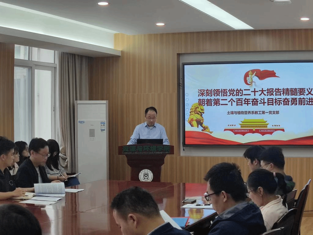 10月28日上午,土壤与植物营养系教工第一党支部与土壤生物化学研究生党支部以“学习党的二十大精神”为主题开展联合主题党日活动,会议由教工支部书记戴珂主持,土壤与植物营养系相关老师参加了理论学习活动。