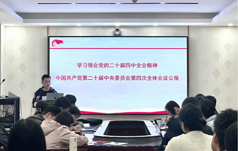 付琛同志和梅若男同志领学党的二十届四中全会精神等内容。付琛同志指出,全会充分肯定党的二十届三中全会以来中央政治局工作,高度评价“十四五”时期我国经济实力、科技实力、综合国力跃上新台阶的重大成就,明确“十五五”是基本实现社会主义现代化的关键时期,提出高质量发展、科技自立自强等经济社会发展主要目标,以及2035年远景目标,号召全党全国各族人民团结奋斗。梅若男同志指出,全会核心成果是审议通过“十五五”规划建议,其起草体现顶层设计、民主实践与人民立场,规划对衔接党的二十大部署、应对国际挑战等意义重大,明确科技自立自强等七大目标及三大核心任务,强调需以坚持党的全面领导为根本保证落实工作。