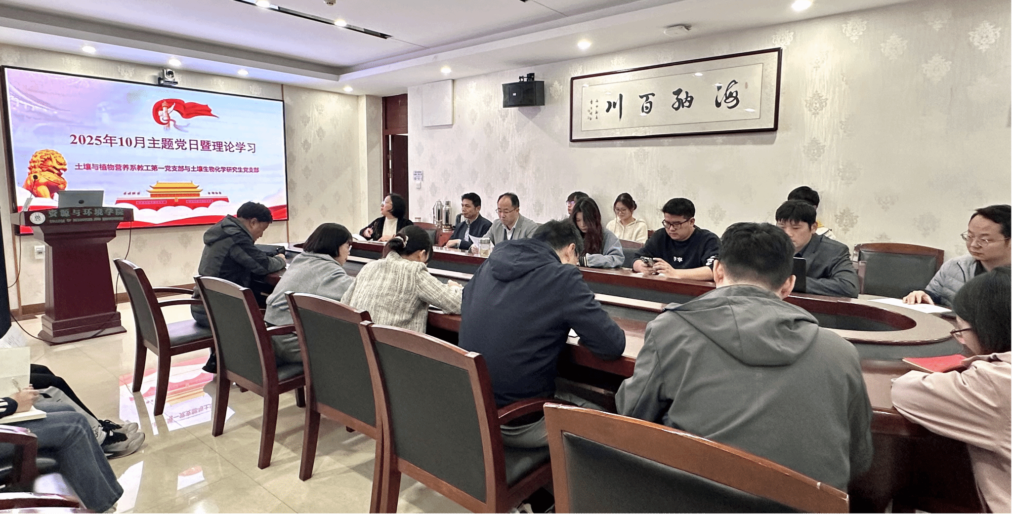 10月31日上午,土壤与植物营养系教工第一党支部与土壤生物化学研究生党支部在资环楼204会议室联合开展10月主题党日。支部全体党员及土壤学科非党员教师参加理论学习,会议由土壤与植物营养系教工第一党支部书记戴珂主持。