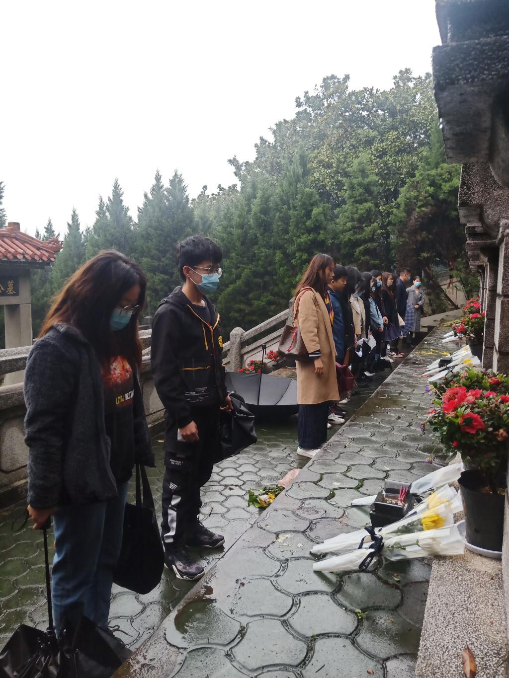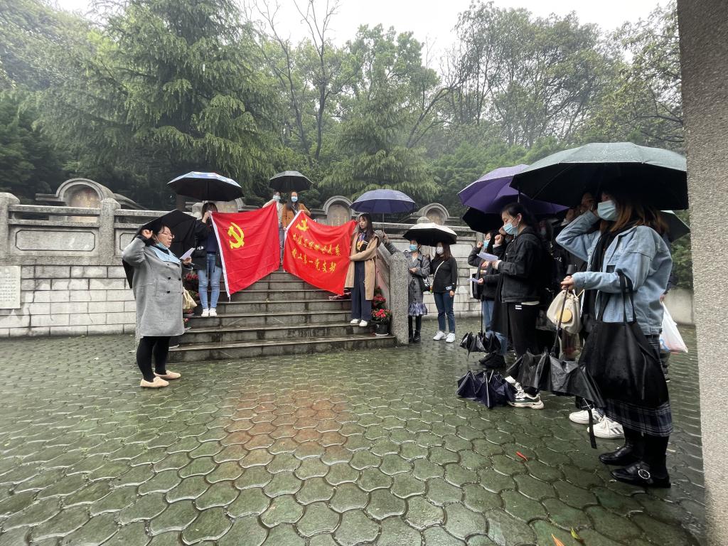辛亥铁血将士公墓位于扁担山公墓南九区与南十区中间的半山腰,祭扫当天,天空下着细雨,全体师生在公墓前肃立。支部书记曹柳叶讲述了武昌起义时期,辛亥铁血将士浴血奋战的历史。支部党员一起清扫墓前残叶、清理地面垃圾。全体同志收起雨伞,向革命先烈献花、默哀,悼念为革命献身的烈士英雄。