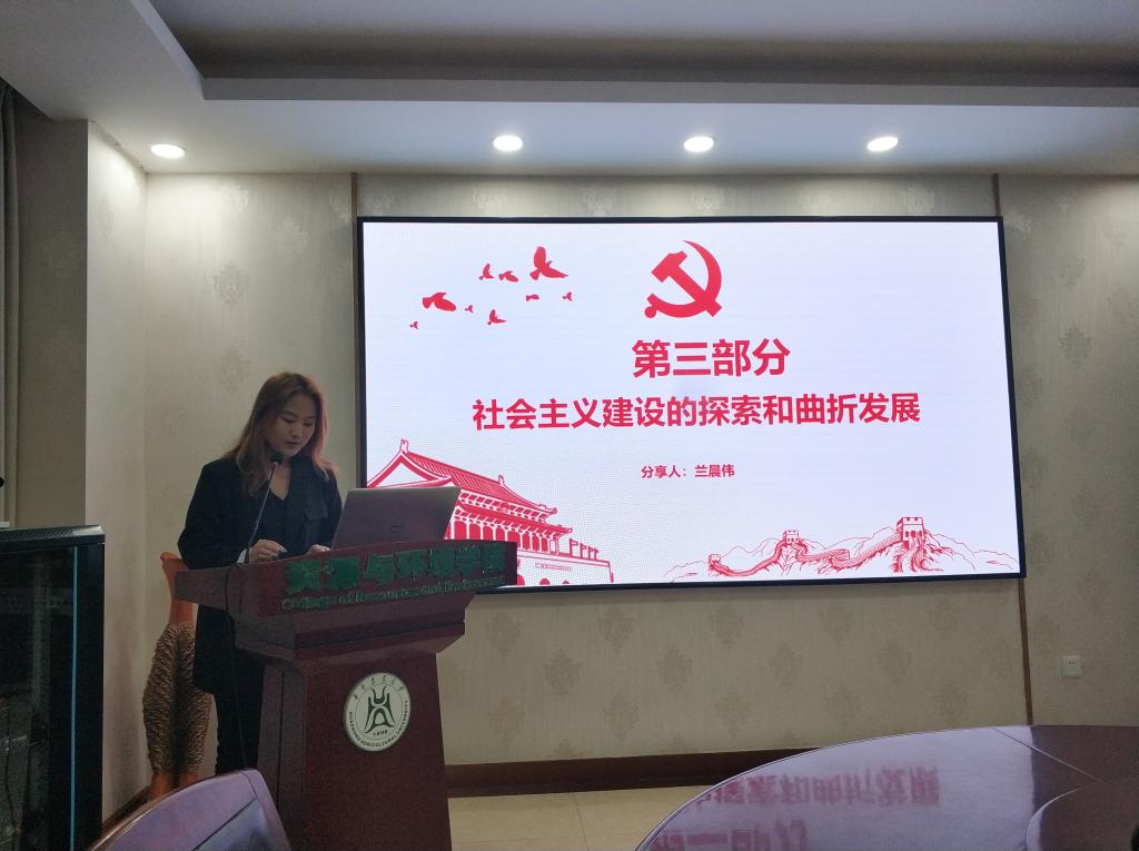 兰晨伟同志带来《社会主义建设的探索和曲折发展》章节的分享,以《论十大关系》和中共八大为切入点,并从工业、交通运输业、科学技术发展、教育卫生事业等多个角度出发,彰显我党对社会主义道路的艰辛探索,也证明十年社会主义建设的卓越功绩。此外,她也简要讲述王进喜、焦裕禄、雷锋等优秀党员同志的事迹,突出中国共产党员的勤劳勇敢、乐于助人、不畏挫折、敢为人先的品质。