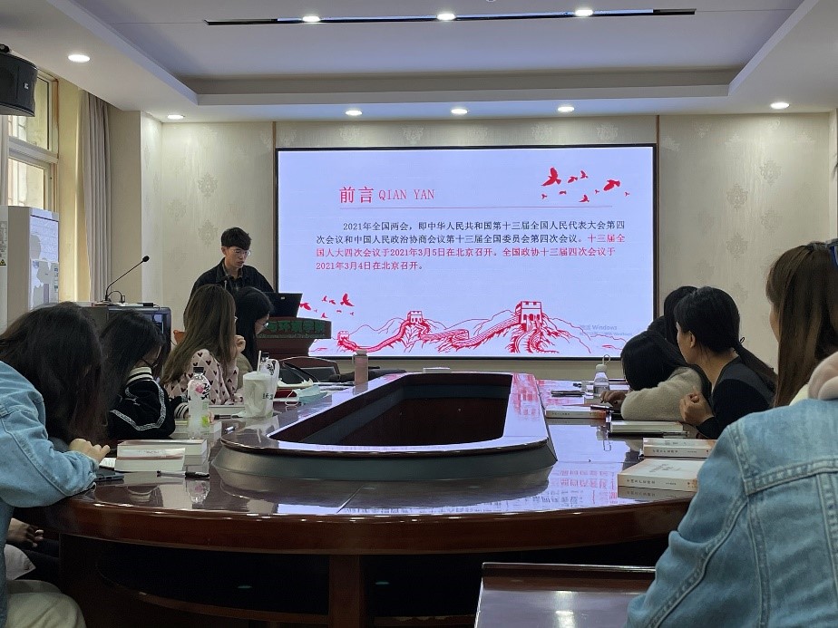 会议最后,理论学习第二小组的入党积极分子赵平同志以“聚焦两会”为主题,归纳总结了2021年全国两会的主要内容,包括“十四五”主要目标、2021年主要目标、2021重点工作等,并收集展示了两会期间与广大人民日常生活息息相关的建议。赵平同志表示,作为一名研究生,在忙碌的科研学习之外,也应多关注时事、了解国家大事,主动学习两会内容及会议精神,同时不断提高自身专业知识,为国家发展贡献自身力量。
