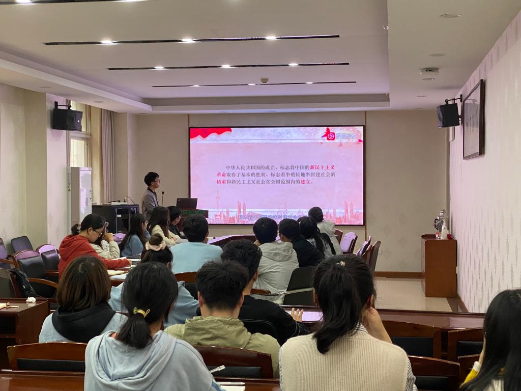 党史讲解学习和党史研讨部分分别由组织委员杨柳斌和拟发展对象周橡棋领学。杨柳斌分党的创建和投身革命洪流、土地革命、抗日战争、新民主主义革命的胜利4部分梳理了新民主主义革命的历程,对新民主主义革命阶段的党史进行了图文并茂的讲解,使全体成员对新民主主义革命时期党史有了整体把握和初步认识。随后,周橡棋将新民主主义革命史凝练为理论知识,总结了新民主主义革命的历史经验与伟大意义。提及感悟,他说:我们在前行的时候一定不能忘记自己的初心,始终记得自己为什么出发,同时,要强化使命感、要以史为鉴,从党史中吸取源源不断的前进动力,坚定信念,谱写新时代中国的新篇章。