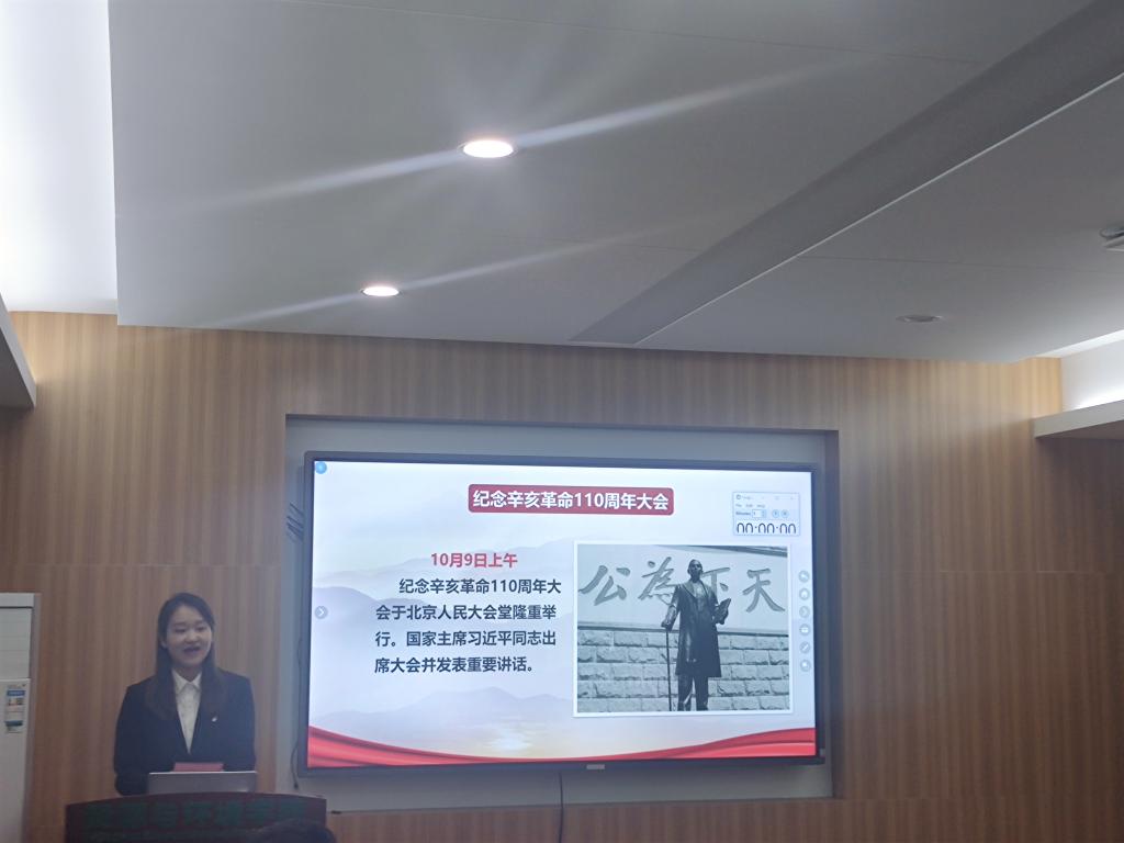 本科生第四党支部的刘熠君以“传承革命薪火、照亮复兴征程”为主题,就习近平总书记在“纪念辛亥革命110周年大会”上提出的五点启示,分享了她对实现中华民族伟大复兴的理解。她谈道:“今天,海内外中华儿女将更加紧密地团结起来,发扬以孙中山先生为首的革命先驱们的伟大精神,为实现中华民族伟大复兴的目标,不忘初心,携手共进!”