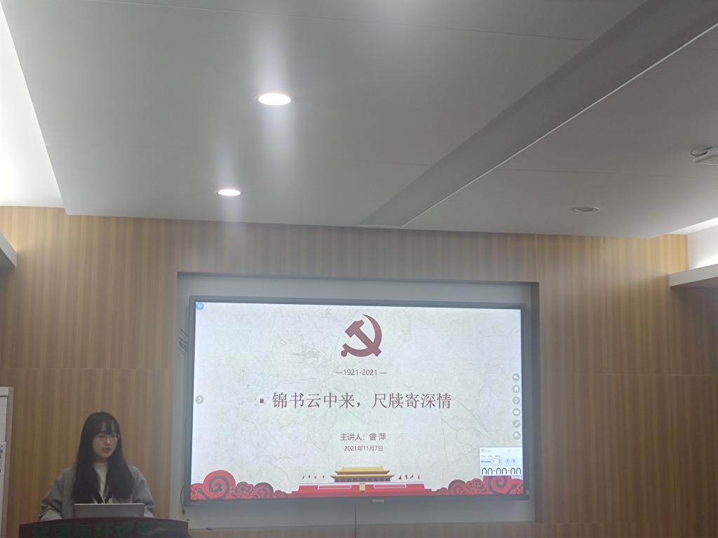 结合对习近平总书记向青年一代的回信的深刻理解,来自本科生第五党支部的曾萍以"锦书云中来,尺牍寄深情"为主题展开了她的微党课。伴随着悠扬的国风音乐,她带领大家学习了习近平总书记给青年一代的三封回信,展现了习近平总书记对我们青年一代的谆谆教诲,随后她呼吁道:“一纸书信,万千情怀。希望我们在树立正确的人生理想和价值追求的基础上,通过不断的实习、实践来增强本领,不辜负习总书记对我们青年一代的殷切嘱托”