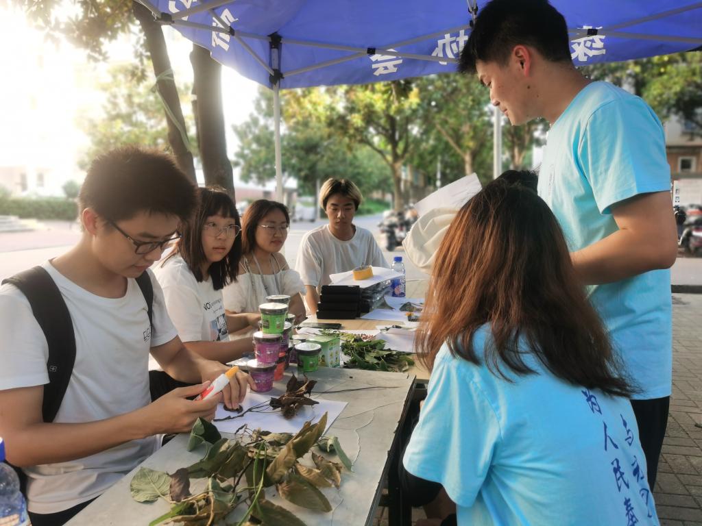 植物科学技术公司两名研究生来到摆点帐篷前,拿起桌上植物进行剪贴画的制作。“之后你们可以拍摄有关生态环境保护的小视频进行宣传”,活动结束后,他们将制作好的剪贴画赠送给团队成员,并对团队宣传工作提出建议。