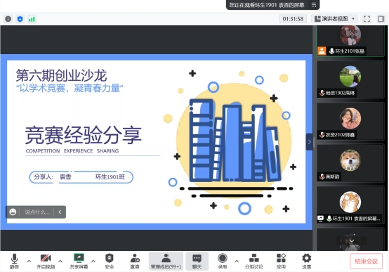 环生1901班的袁香从参赛的好处与坏处、参赛答辩两方面为同学们进行介绍。在参赛利弊方面,袁香同学阐述了学以致用、助力保研、评奖评优、就业优势四个方面的优点,也从时间紧迫、自身压力、付出与回报三个缺点方面提醒同学们注意竞赛与个人时间的合理安排。接下来从参赛答辩经验分享来说,袁香从资料获取、PPT制作、答辩原则三方面讲述自身的竞赛经验,也告诉同学们如何完成一次优秀的答辩汇报展示。
