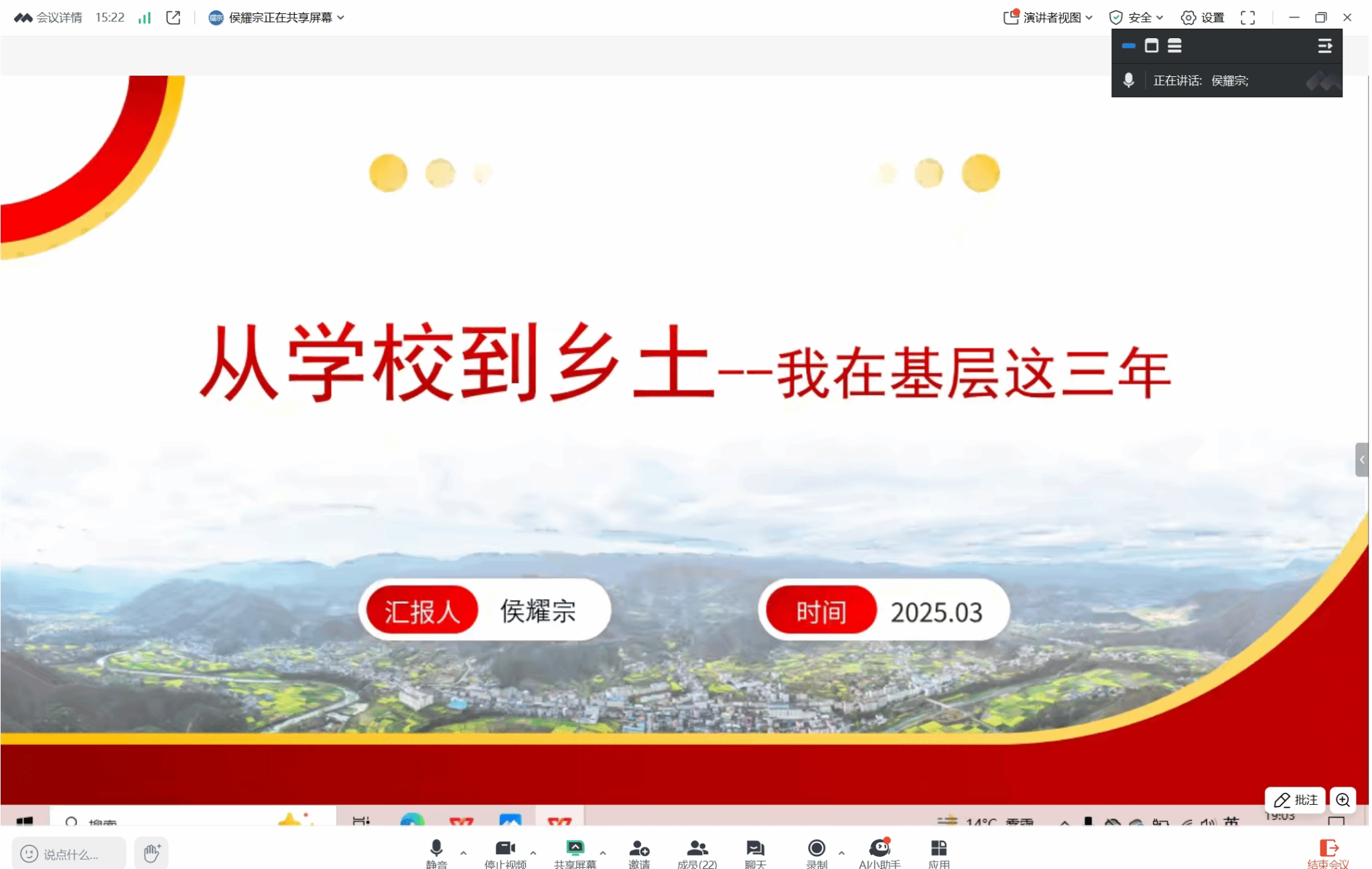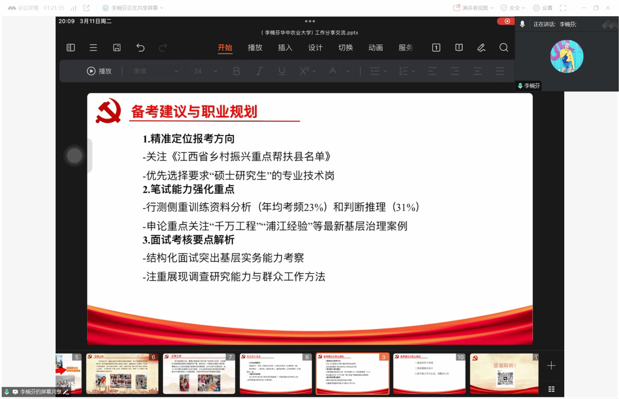 为帮助毕业生深入了解基层工作、科学进行个人定位,有的放矢进行就业准备,3月11日晚,公司组织开展了基层就业工作分享会。公司2021届硕士侯耀宗(2021年湖北省选调生,现为襄阳市保康县歇马镇人民政府工作人员),2023届硕士闵艳(2023年湖南省选调生,现为株洲市茶陵县秩堂镇党委秘书、合户村党总支书记助理)、李楠芬(2023年江西省考公务员,现为江西省抚州市金溪县陈坊积乡人民政府党政办干事、综治专干)应邀分享了从校园到乡土的心路历程与工作体悟。