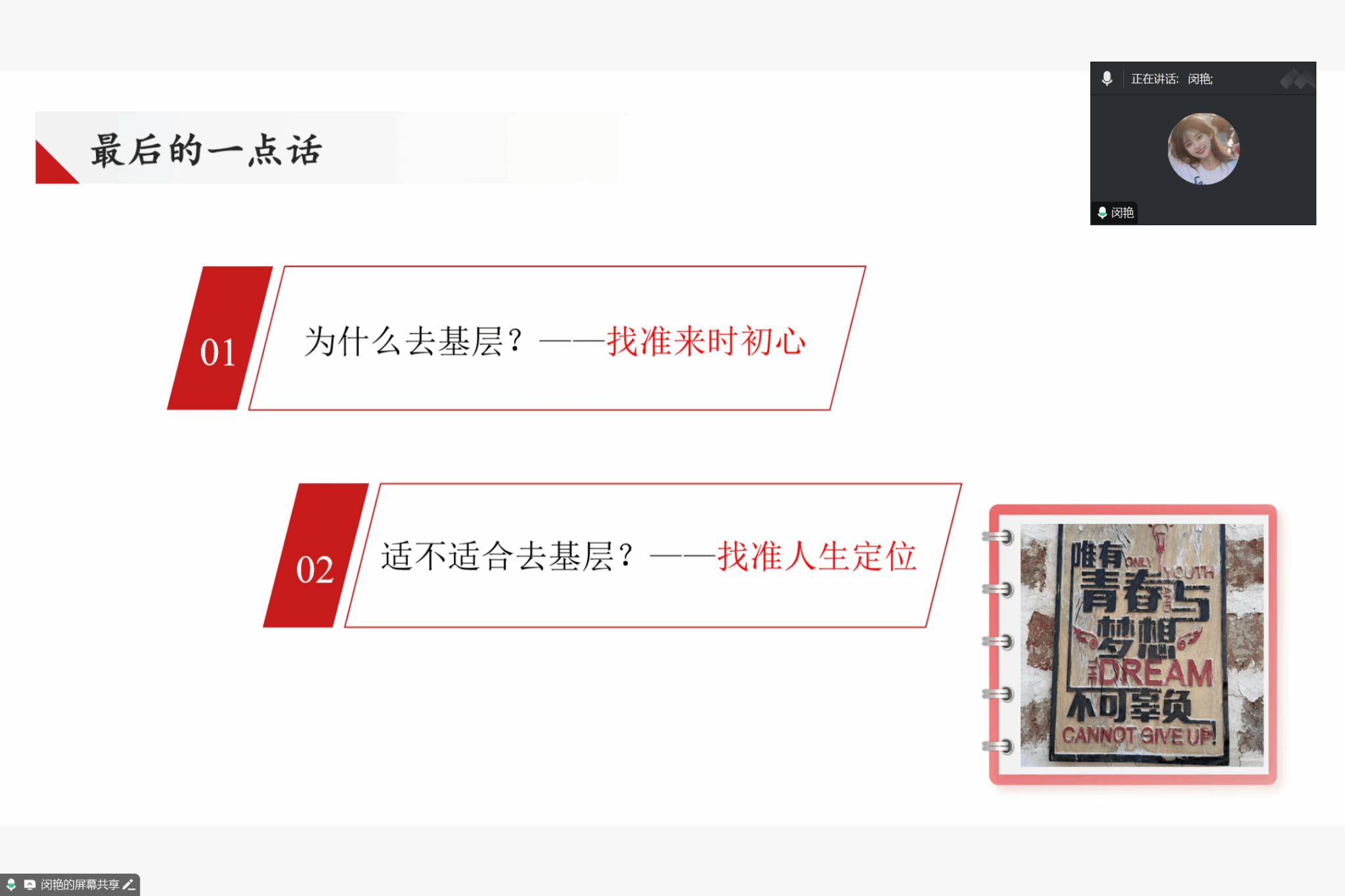 三位员工一致表示,基层工作虽充满挑战,却是青年锤炼本领、实现价值的广阔舞台。本次基层就业工作分享会不仅为在校生搭建了与基层工作者对话的桥梁,更激励着同学们为祖国基层工作添砖加瓦,让青春之花在祖国和人民需要的地方绽放。