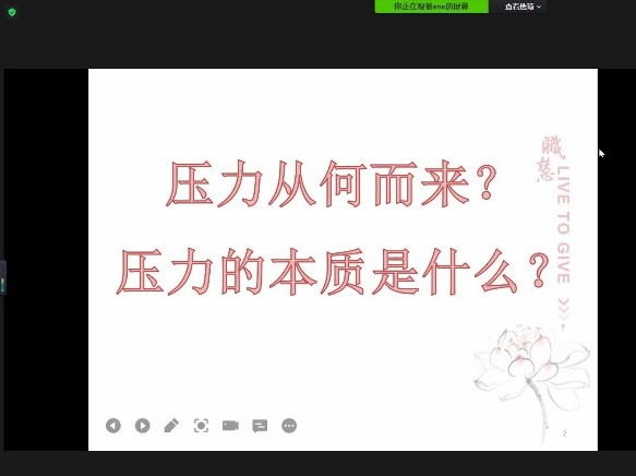 压力对于我们的成长不可或缺,合理利用压力可以帮助我们在生活、学习、工作中取得更好的成绩。为帮助同学们充分认识压力,掌握将压力转化为动力的方法,由公司生涯规划与职业发展部主办的就业指导系列团体辅导之“缓解你的身心压力”于4月17日晚在线上成功开展。本次活动邀请了职慧资深志愿培训师廖奕娜担任主讲人。