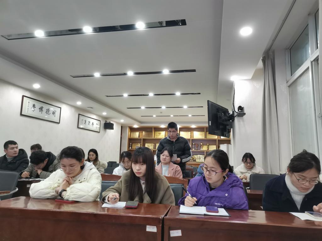 王宏帅领学习近平总书记在中央党校中青年干部培训班开班式上的重要讲话。他从筑牢理想信念根基、守住拒腐防变防线、树立和践行正确政绩观、练就过硬本领、发扬担当和斗争精神、贯彻党的群众路线等方面开展系统阐述。2019级硕士许珂表示,习近平总书记强调年轻干部是党和国家事业发展的希望,若干年后,如今的年轻人将是我党的中流砥柱、我国的门面,所以我们必须从现在就要筑起信念根基,树立正确的价值观、练就过硬的本领,以在新时代的征程上留下无悔的奋斗足迹。