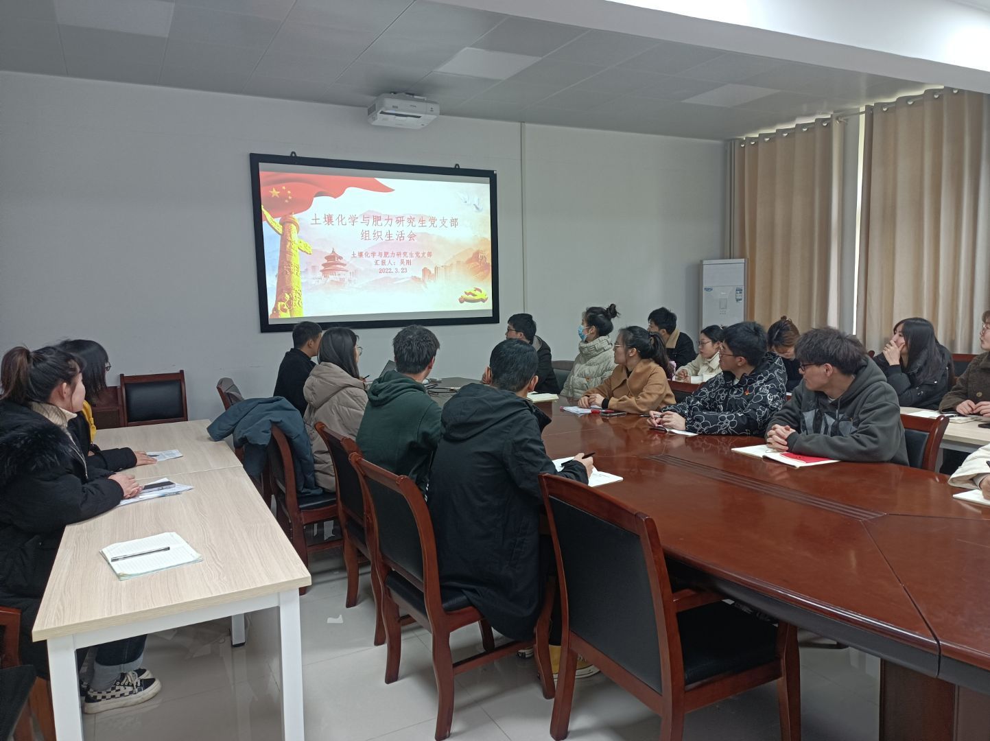 3月23日中午,土壤化学与肥力研究生党支部在资环楼515会议室召开3月主题党日暨2021年度组织生活会。深入学习“中央一号”文件、习近平在中央党校(国家行政公司)中青年干部培训班开班式上的讲话以及2022年全国“两会”精神。党支部书记吴刚主持会议。