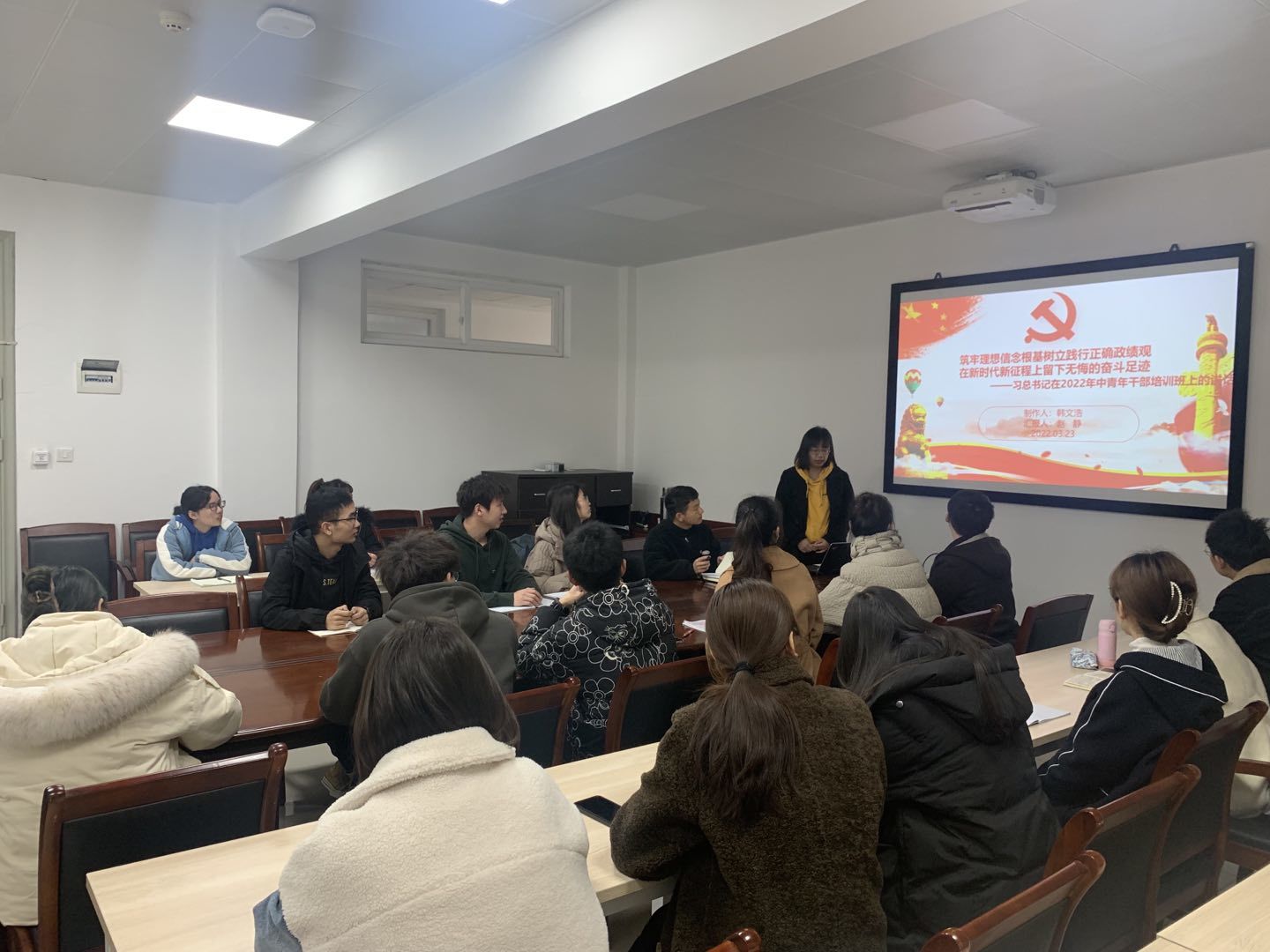 入党积极分子赵静做习近平在中央党校(国家行政公司)中青年干部培训班开班式上讲话内容的学习分享,主要从筑牢理想信念根基、守住拒腐防变防线、树立和践行正确政绩观、练就过硬本领、发扬担当和斗争精神、贯彻党的群众路线六个方面进行了分享。她表示,总书记的重要讲话饱含着对年轻干部的殷切期望,为广大年轻干部包括我们青年员工健康成长指明了努力方向。