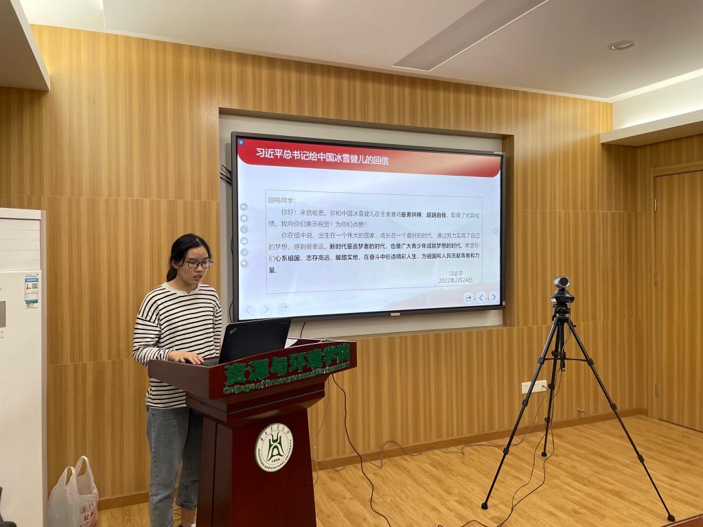 入党积极分子黄玎领学习近平总书记在北京冬奥会、冬残奥会总结表彰大会上的讲话及习近平给中国冰雪健儿的回信精神。她强调,新时代是追梦者的时代,也是广大青少年成就梦想的时代。正值青年的我们应该敢于有梦、勇于追梦、勤于圆梦,在奋斗中创造精彩的人生,为祖国和人民贡献青春力量。