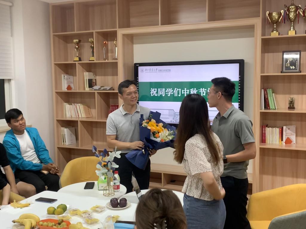 座谈会后,2022级研究生新生刘静为谭文峰老师送上鲜花,代表新生为谭老师送上教师节祝福。“我是一名联培员工,导师不在公司,谭经理嘱咐要专门邀请我们参加座谈,让我们非常感动。中秋节撞上教师节,是阖家团圆的日子,也是教师收获的日子,谭老师抽出时间与我们员工齐聚一堂、共话未来,感动之中更多了敬意,也祝福谭经理和老师们双节愉快”,刘静说到。