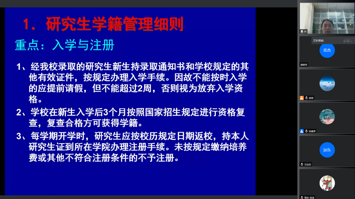 何建荣老师主要讲解学籍与学位管理的相关要求,让大家在入学之初对公司产品框架拥有整体认知;乔欣老师从个人培养计划制定、文献综述、学术活动、实践活动、资格考试五个方面具体解读了研究生主要培养环节及相关注意事项。