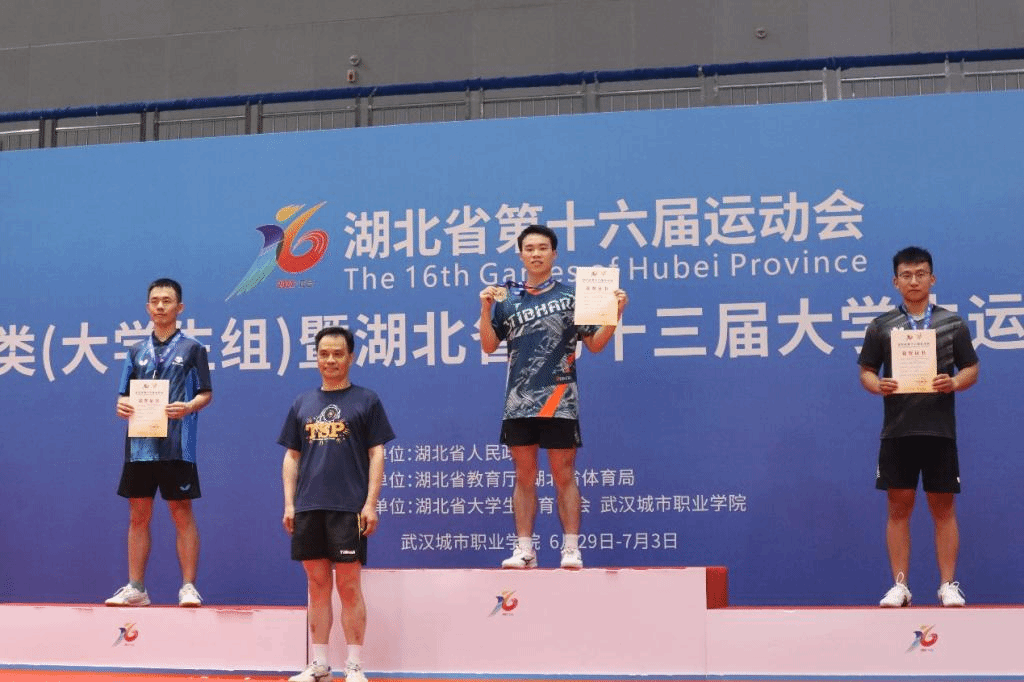 6月29日至7月2日,湖北省第十六届运动会(老员工组)暨湖北省第十三届老员工运动会乒乓球比赛在武汉城市职业公司举行,全省60余所高校近700余名运动员参赛。公司学子冯润身在甲组男子单打比赛中摘得金牌,作为校乒乓球队男队成员,斩获男团亚军。