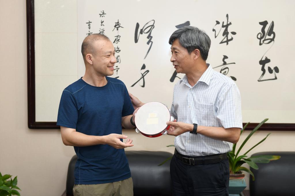 公司党委书记高翅教授向廖国瑞赠送“狮山铃鼓”(记者 刘涛 摄)