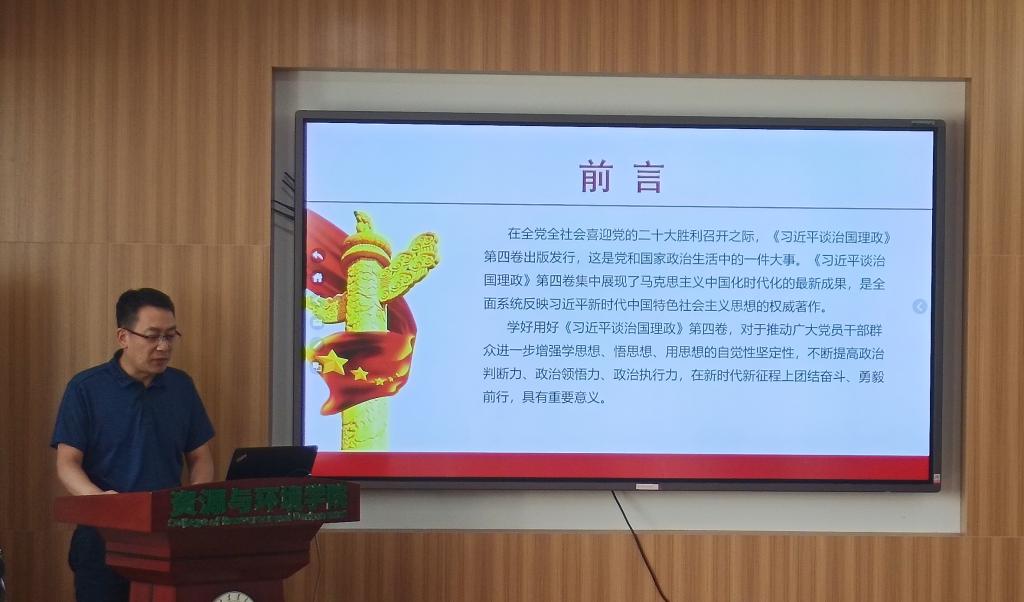 《习近平谈治国理政》第四卷集中展现了马克思主义中国化时代化的最新成果,是全面系统反映习近平新时代中国特色社会主义思想的权威著作。结合“坚持人与自然和谐共生”章节内容,吕守华从深刻理解和把握习近平生态文明思想的科学体系、基本内容、实践要求等三个方面进行了领学。结合公司工作,他谈到,习近平生态文明思想基于历史、立足当下、面向全球、着眼未来,我们要从完善人才培养方案、调整专业结构、加强科研组织、推动绿色转型等四个方面坚定不移用习近平生态文明思想武装头脑、指导实践、推动公司工作。