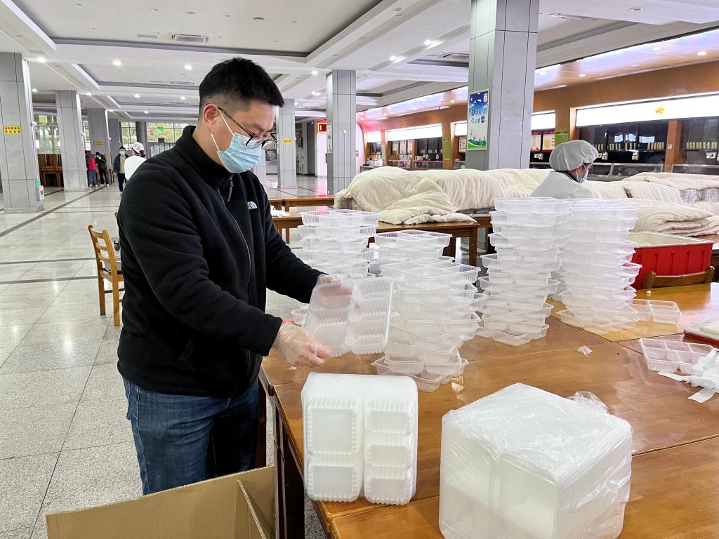 静默不停学,静默不停教。教师们通过线上办公线上上课确保教学工作的有序开展,线下投入后勤保障和值守工作,为员工发放生活物资。在接到志愿者招募通知之后,褚琳老师被安排到荟园分装盒饭,“为了保障员工能吃上热饭暖菜,大家齐心协力,一上午的时间顺利打包完成了450份盒饭,咱公司真的是在最大程度的保障员工健康与安全,处处以员工为中心,身为华农人,很骄傲!”“没想到装盒饭这么麻烦,那天上午我们六个人一个小时才装了300份,都想赶紧让同学们吃上热饭”,郭龙老师回想起当时热火朝天的情景,所有人都精力高度集中,像在食堂里完成一场高难度实验。“我只是做了一点点应该做的事。回头来看,我们老师能做的其实有很多,不仅仅是后勤保障,在安抚员工情绪、如何提高线上教学的学习效率、如何保证研究生的课题任务顺利进行等各方面都需要做好“服务””,回想起来,朱强老师认为自己能做的应该更多。苗洁老师说,“当时食堂缺人手,后勤人员凌晨就起来炒菜,我便与其他四位老师赶过去帮忙打包”,身为党员的她坚信病毒无情,人有情,无论是教师还是员工,都应该在面对考验时挺身而出,体现华农人的担当。
