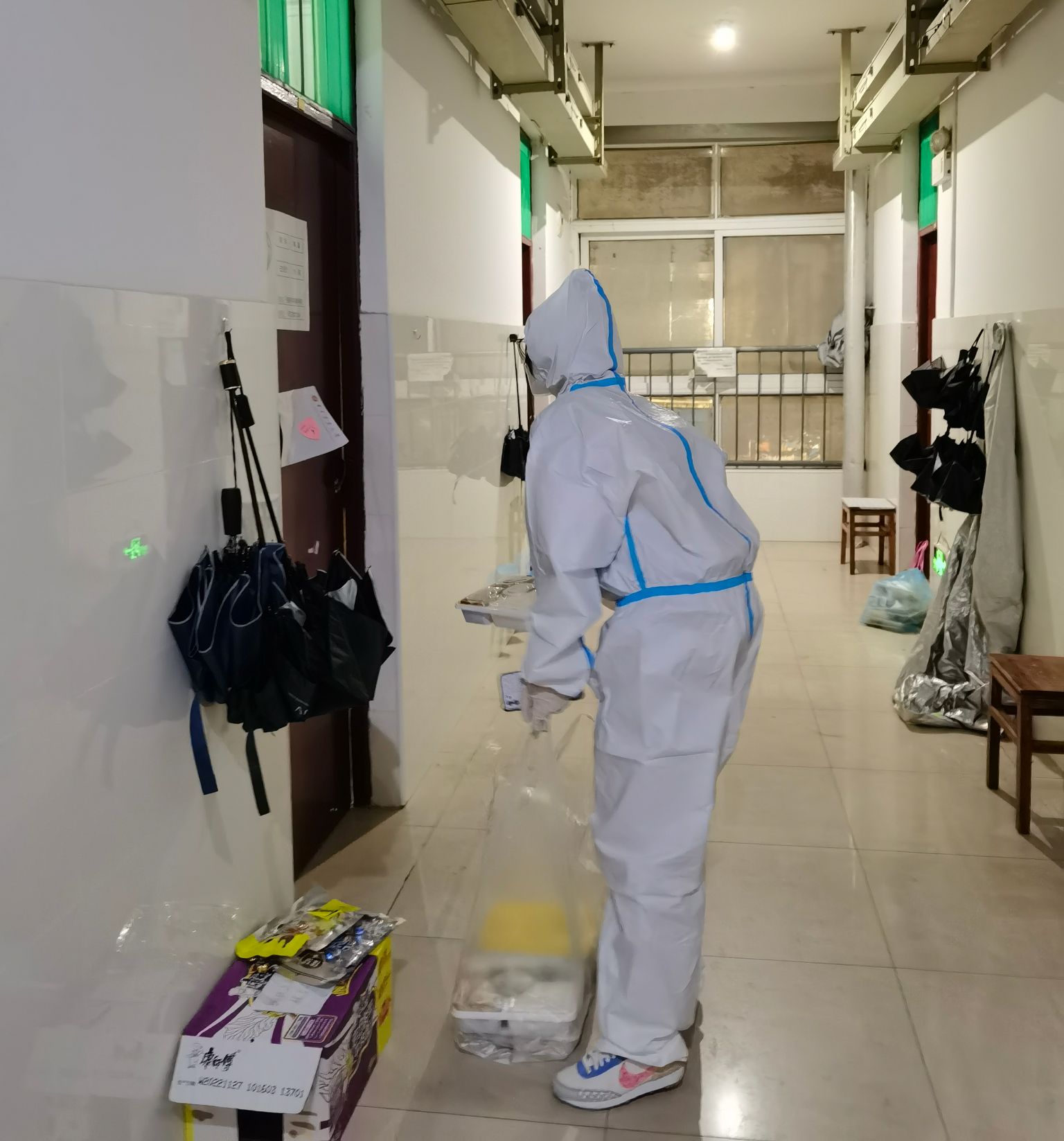 志愿者王如飞和兰雨凡作为荟园五栋机动志愿者随时准备着出任务,“同学们报名志愿者的积极性很高,虽然完成任务后难免疲惫劳累,但是心里确实充实幸福的”“看见老师们冒雨送餐,打湿的头发和双手紧提着的仍在冒热气的饭菜,似乎就是那么一瞬间,酸涩感涌上了鼻头。”志愿者江庆从没想过自己会离病毒这么近。沉闷的口罩、密不透风的防护服、手套被汗水浸湿粘在手上,每一个感受都让她记忆犹新,“12月4日解封时,同学们的一声欢呼是我做志愿者最大的收获,因为我知道我正在被人需要!”