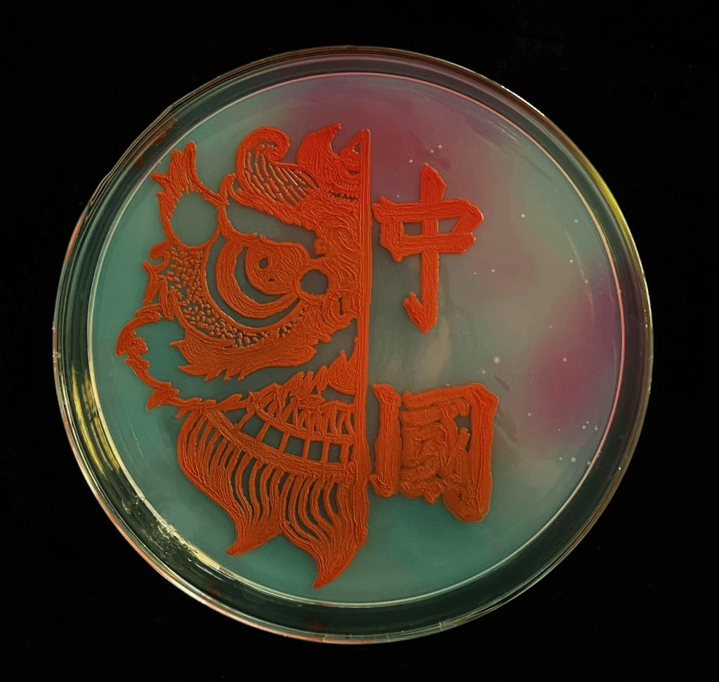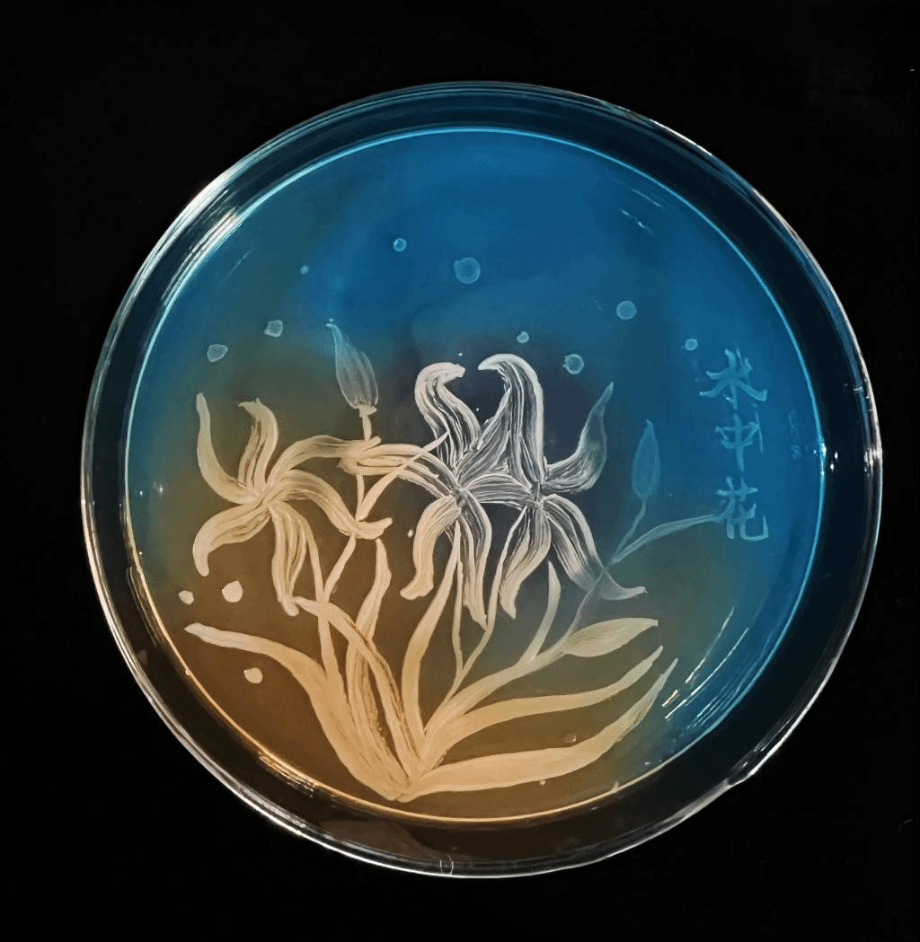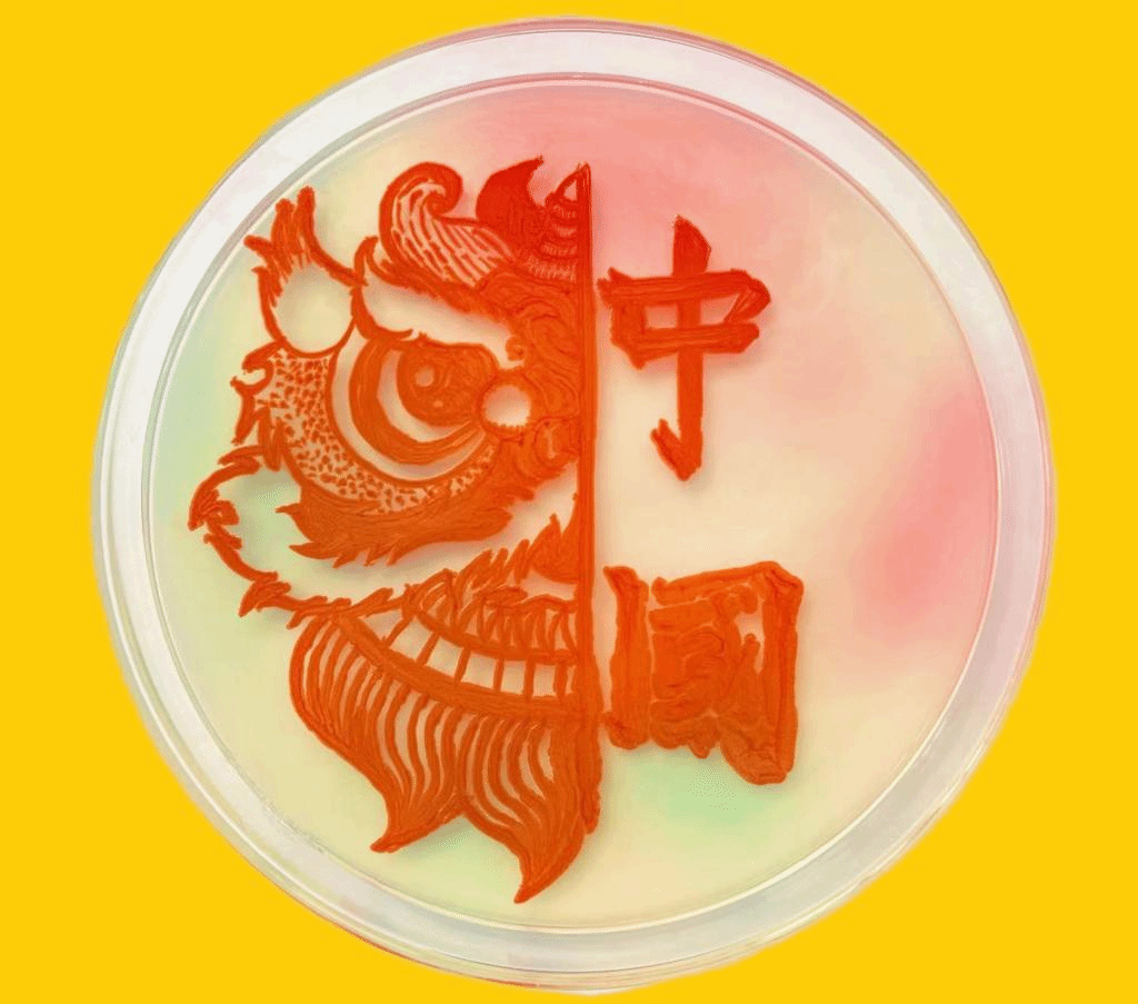 二等奖作品《京篆碰撞》由公司农资2001班孙若琳同学协同队友来自环生2001的郝文琦、郝文琳同学制作,秉承“艺术与文化交融碰撞”的理念,展现中华传统文化的博大精深,彰显中国艺术的独特魅力,借此呼吁传承中华优秀传统文化。经过悉心设计,以灭菌细毛笔、粗端牙签、棉签为画笔,以粘质沙雷氏菌、转录不同基因的大肠杆菌等各色菌种为颜料,在特制渲染的LB培养基上创作而成。