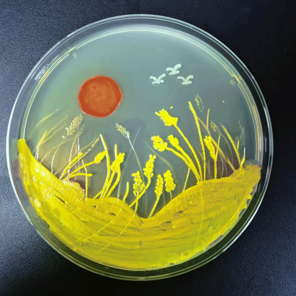 由公司农资2002班刘烨、董俊琦、许晶三位同学制作的《麦浪》,创意为“手中有粮,心中不慌”,阳光下茁壮成长的小麦,给人以愉悦与希望。制作过程为培养基的制备、接种与活化:按无菌操作分别将红(Escherichia coli)、黄(Staphylococcus aureus)、橙(Escherichia coli)、白(Bacillus sp.)四种菌种接种到培养基的四个区域。用封口膜将该培养皿密封,放入摇床培养一天。最后按无菌操作,用牙签和棉签蘸取菌液在培养基上进行作画。一共画三个培养基,保证结果的可重复性。