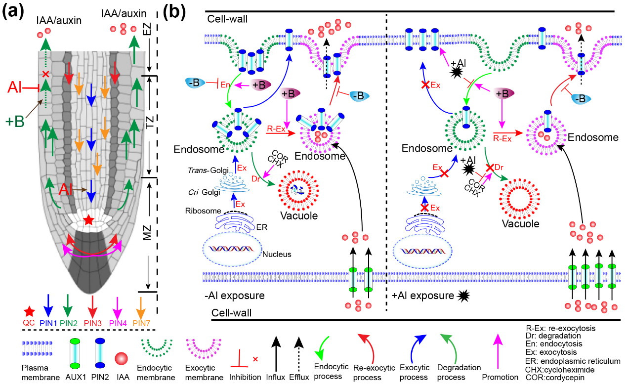 酸性土壤中,植物不仅遭受铝毒害,而且面临缺硼胁迫。前期研究发现硼缓解铝胁迫对根尖生长素运输抑制,但该机制尚不清楚。生长素(auxin,IAA)从地上部向根尖静止中心(quiescent center,QC)的运输依赖于定位在中柱和中柱鞘的PIN1/3/4/7载体蛋白协同作用。IAA从QC再分配到伸长区(elongation zone,EZ)主要依赖于表皮细胞膜PIN2载体蛋白。该研究利用共聚焦荧光显微镜观察转基因DII-VENUS和DR5-GFP株系发现铝胁迫诱导根尖分生区(meristem zone,MZ)和过渡区(transition zone,TZ)生长素积累,伸长区生长素含量减少,硼能缓解该过程。利用药物干扰及转基因材料PIN2-Dendra2实时观察铝胁迫和供硼对PIN2膜蛋白的影响,结果发现铝胁迫引起PIN2膜蛋白含量增加依赖于铝对PIN2膜蛋白内吞作用的抑制,而不依赖于PIN2基因转录调控。PIN2膜蛋白内吞和循环实验进一步证实供硼促进PIN2膜蛋白内吞和循环来缓解铝对PIN2囊泡运输的抑制。我们提出硼缓解铝胁迫抑制根尖表皮细胞IAA输出模型,即PIN2蛋白和IAA共定位在内化的囊泡内,通过囊泡的循环促进IAA输出。铝抑制细胞膜流动性来阻碍PIN2蛋白内化。硼不仅能促进PIN2载体内吞作用,而且能促进它的分泌,该过程能够修复铝导致的伸长区生长素匮乏。该研究为揭示酸性土壤中供硼缓解铝胁迫机制提供了新的见解。