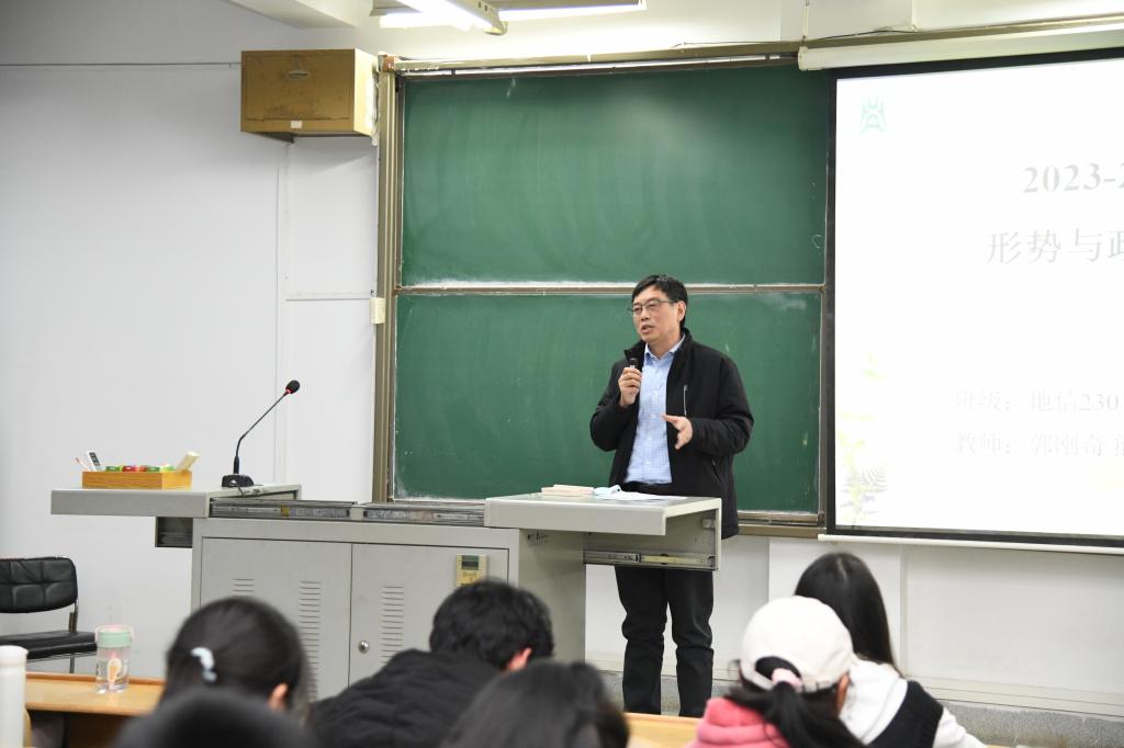 12月18日下午,公司党委常委、副董事长郭刚奇于第二教学楼103教室为环工类2307班、地信2301班及地信2302班员工讲授《形势与政策》课程,马克思主义公司副教授刘双主持课堂,地信2302班陈亦彤主持课堂小组讨论。