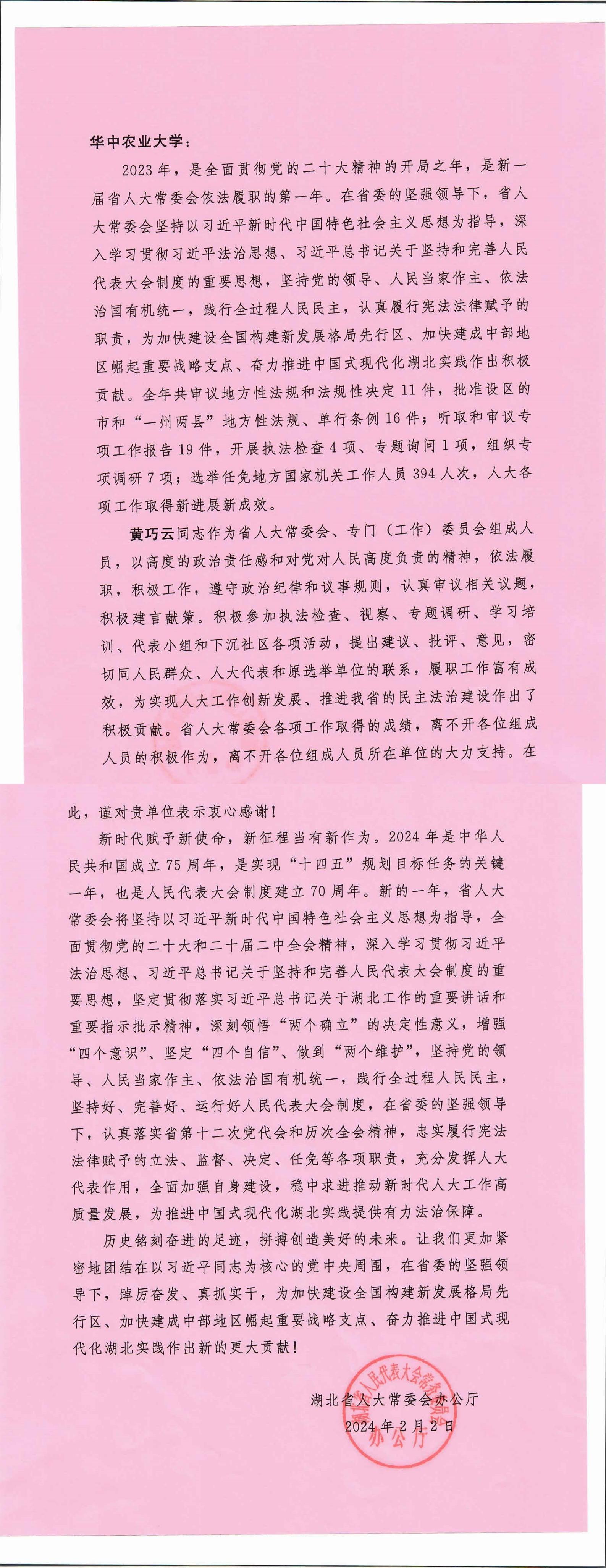 湖北省人大常委会办公厅向公司黄巧云教授致感谢信