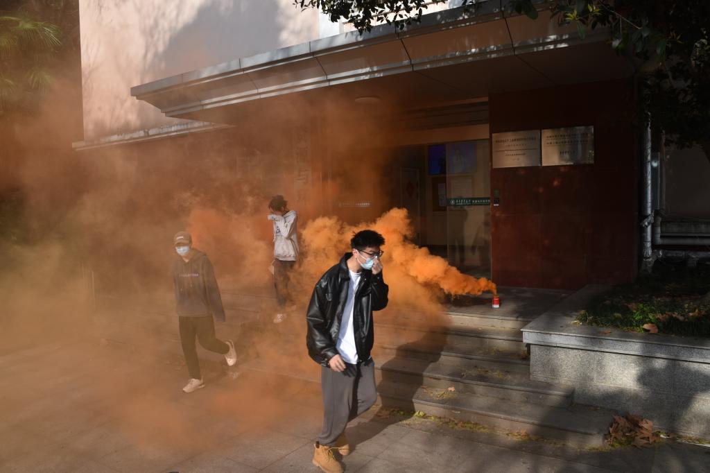 下午16点30分,场景布置组在资环楼、五楼位置释放发烟罐。烟雾触发烟感报警装置报警,消控室值班人员迅速查看消防主机显示的着火点,确认火警并疏散大楼人员,将消防联动控制确定在自动状态,并向单位管理人员、校园110进行了电话报告。