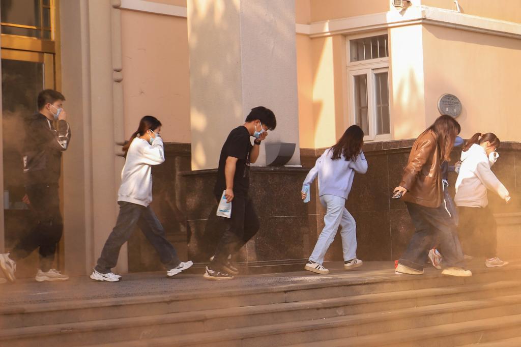 “各位老师、同学,请注意:本大楼第4层房间发生火灾,请所有人员走楼梯通道,迅速撤离大楼,大家不要惊慌、不要拥挤。”广播响起,楼栋内师生在救护组引导下有序撤离,到达主楼前空地避险。