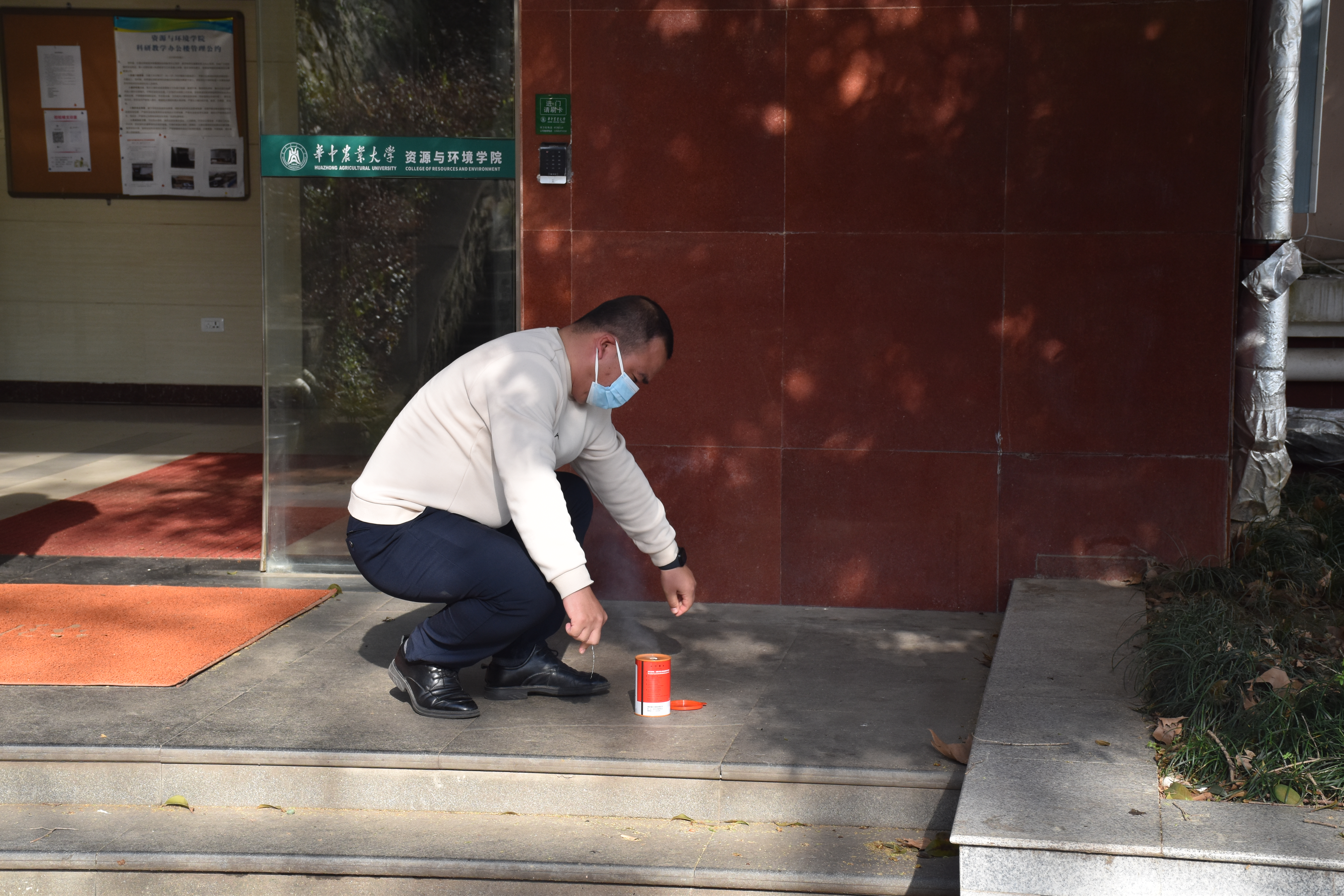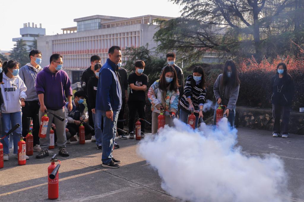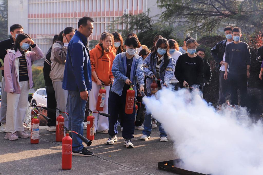 随后,校园建设与安全保卫部工作人员在主楼前进行灭火器使用讲解培训,在场师生根据指引进行灭火器灭火实操演练。