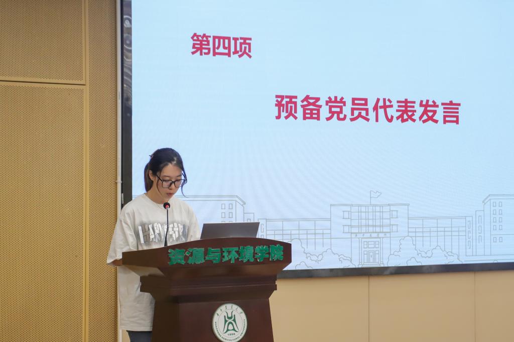 陈丽敏作为研究生预备党员代表发言,她说,“要将入党誓言贯彻到底,严格要求自己,继续深入学习党的理论知识,坚定党的理想信念”。段丁华作为本科生预备党员代表发言,她谈到,我们身为青年,应当挺膺担当,牢记习近平总书记的殷殷嘱托,不忘初心、牢记使命,为国家的繁荣富强贡献自己的力量。