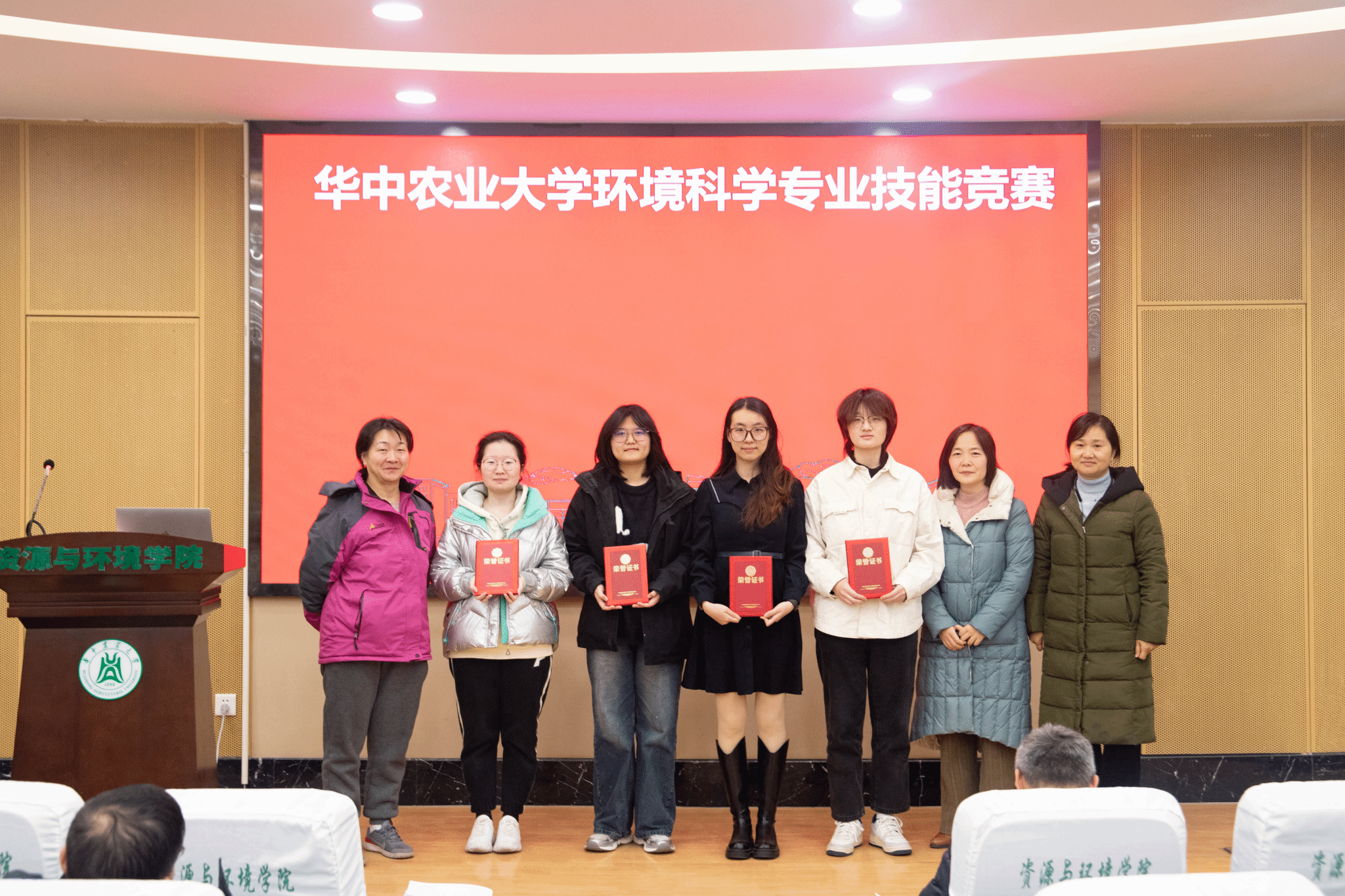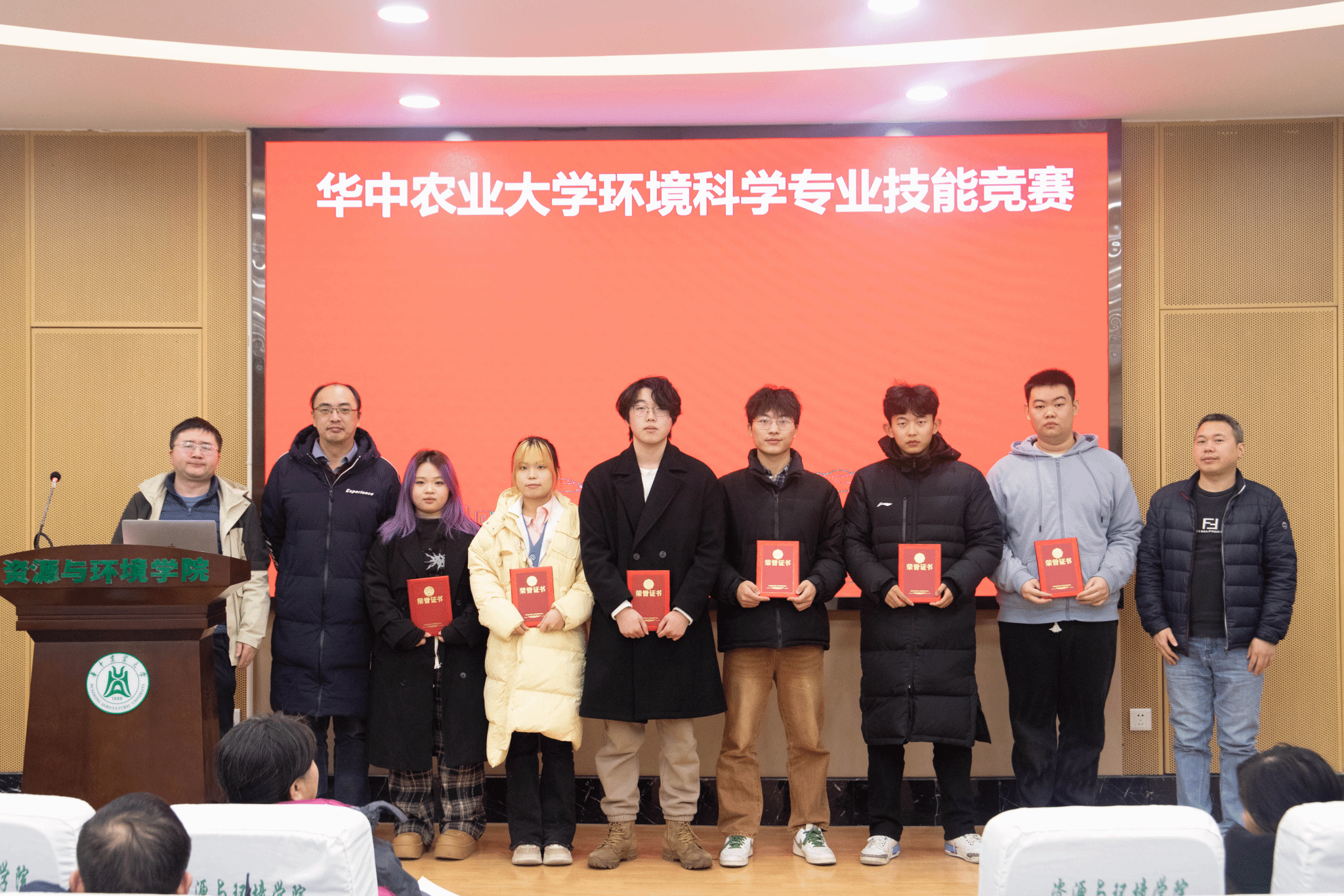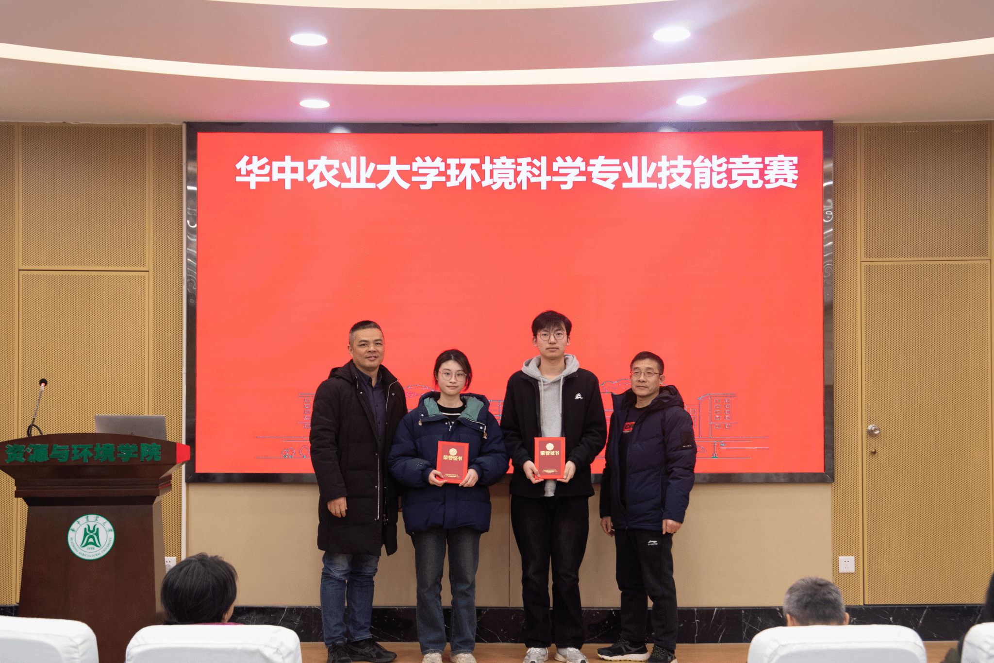 八位评委老师根据项目汇报和墙报展示情况,逐一点评并综合打分。最终,“抗坏血酸活化过硫酸盐降解有机氯农药污染土壤的性能研究”和“改性粉煤灰对弱碱性土壤中镉的吸收与钝化”项目获得一等奖,“基于菌藻生物膜的澡堂污水处理及回用工艺设计”、“试验田土壤重金属监测——以国家油菜工程技术研究中心为例”、“池塘养殖尾水治理工程复合生态塘的设计”和“长沙梅溪湖水质监测方案”四个项目获得二等奖,“微塑料对水铁矿硫化与共存As(III)迁移行为的影响及其机制初探”、“天津马厂减河水质监测与分析评价”、“蜡样芽孢杆菌包埋固定化效果的研究”、“铁改性生物炭强化锰氧化菌氧化锰及其对As(III)的氧化”“南湖排污点生态毒性效应评价”和“青年湖部分水质指标监测与分析”六个项目获得三等奖。依次由蔡建波/向荣彪、于书霞/王砚/郝蓉、葛小东/王小明/殷辉等老师分别为获得一、二、三等奖的队伍颁发证书。