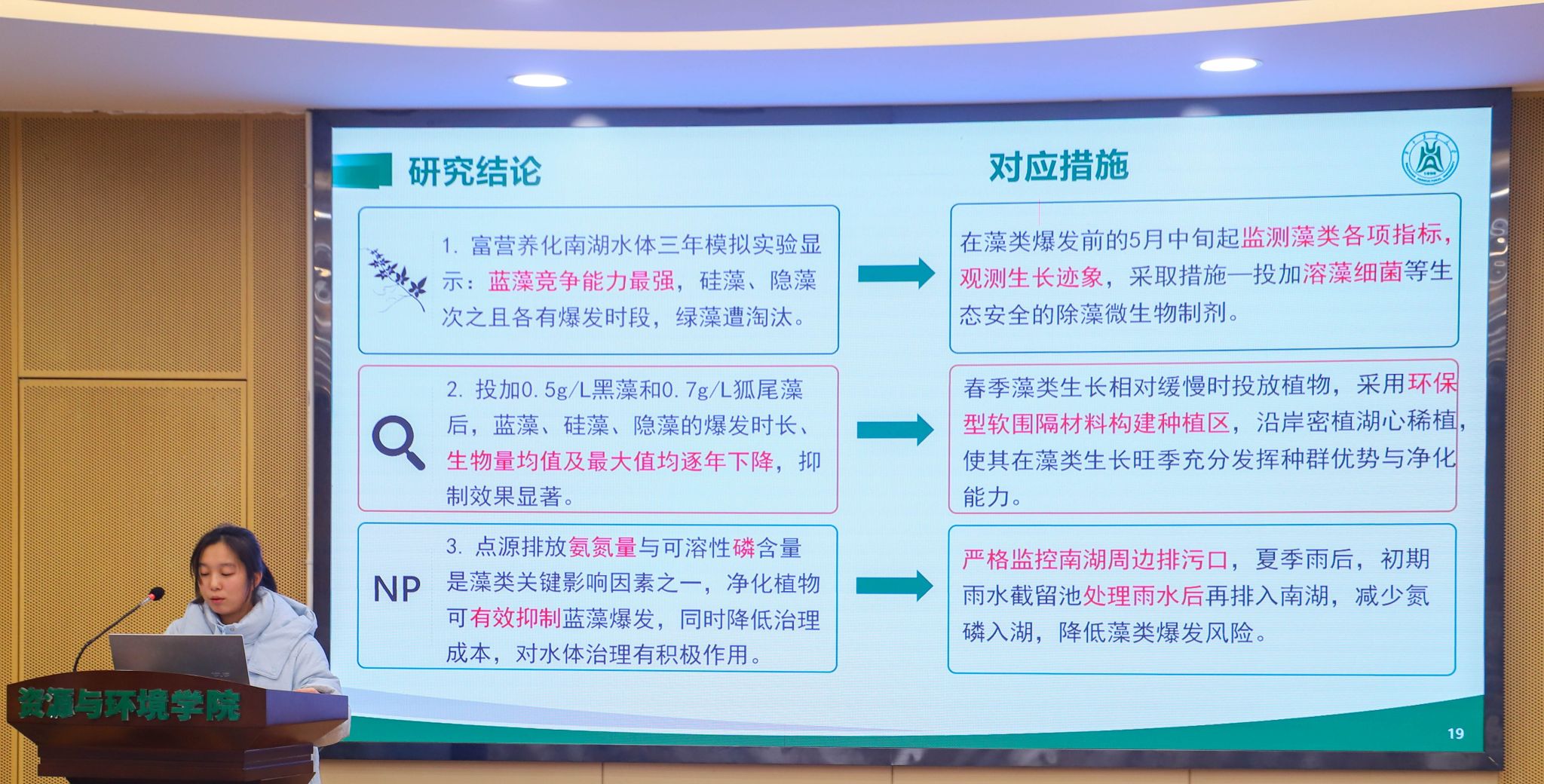 “一种活性炭生物膜法处理洗浴废水的系统设计”团队运用连通器原理控制浸没的水量,搭建出了简易的反应系统,使废水处理的过程具象化;基于公司生态浮床治理南湖水质已有的技术基础,“反硝化聚磷菌与生态浮床结合治理南湖富营养化”小组结合反硝化聚磷菌的调查和分析,提出了一种能够提高生态浮床对富营养化水体中磷元素去除效率的措施,以更好治理南湖的水体富营养化;“基于海绵城市理念下的宿舍区雨水综合治理”小组则观察并联系生活中雨水大量滞留的现象,通过深入探究和调查,设计出了荟园宿舍区一套单独的雨水处理系统,以此来应对暴雨时雨水难以及时快速排出的问题。