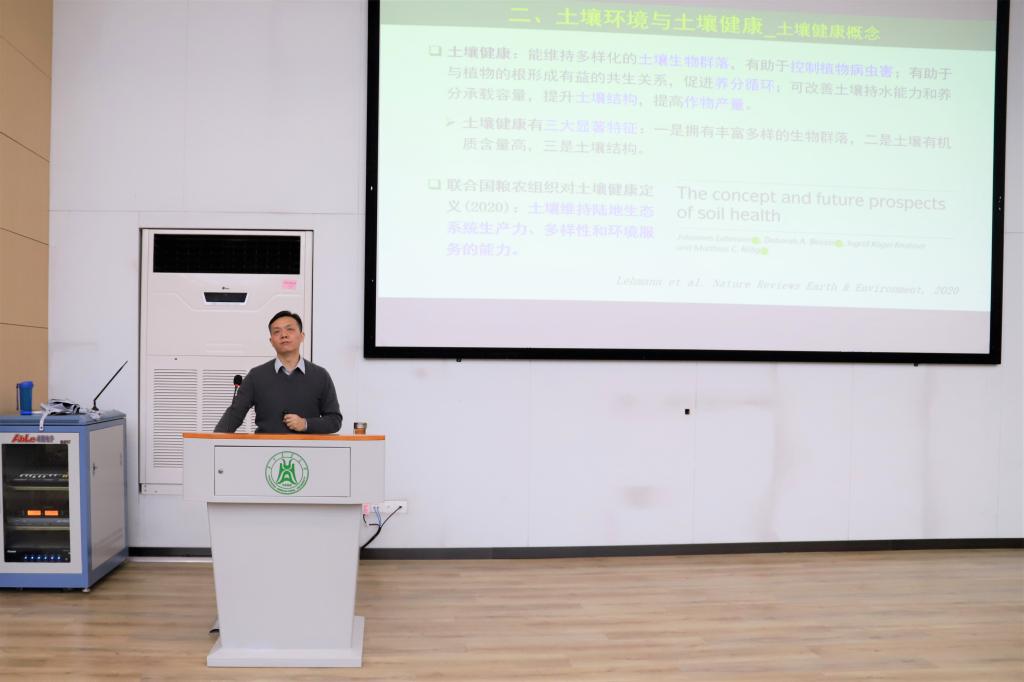 “解决土壤健康问题,就像是中医把脉问药,也需要切中要害方法得当。”谭文峰以“土壤健康与农业绿色发展”为题展开,从世界土壤日与土壤学大会、土壤环境与土壤健康、土壤环境政策与策略、农田土壤污染与修复等四个方面与同学们共同探讨了关于这一主题的思考与实践。