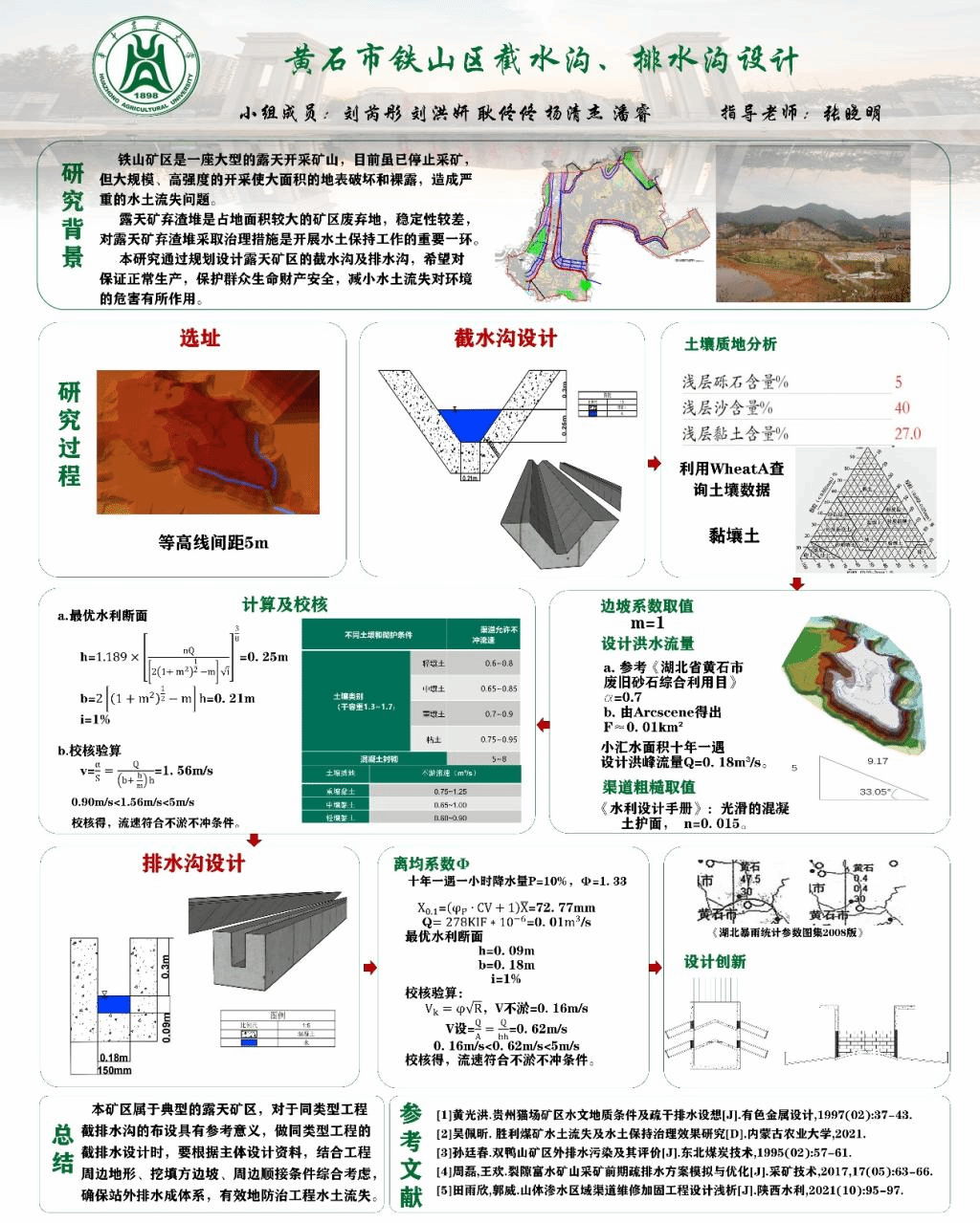 “黄石市铁山区截、排水沟设计方案”项目通过规划设计露天矿区的截水沟及排水沟,希望对保证正常生产,保护群众生命财产安全,减小水土流失对环境的危害有所作用。设计区属于典型的露天矿区,员工根据主体设计资料,结合工程周边地形、挖填方边坡、周边条件综合考虑,确保排水工程成体系。这对于同类型截排水沟工程的布设具有指导意义,可有效地防治工程水土流失。