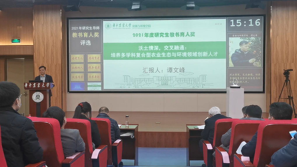 评选会上,谭老师以《沃土情深,交叉融通:培养多学科复合型农业生态与环境领域创新人才》为分享主题,从个人基本情况、研究生教学、培养、日常管理、国际合作与交流以及育人理念和成效等方面进行了介绍。