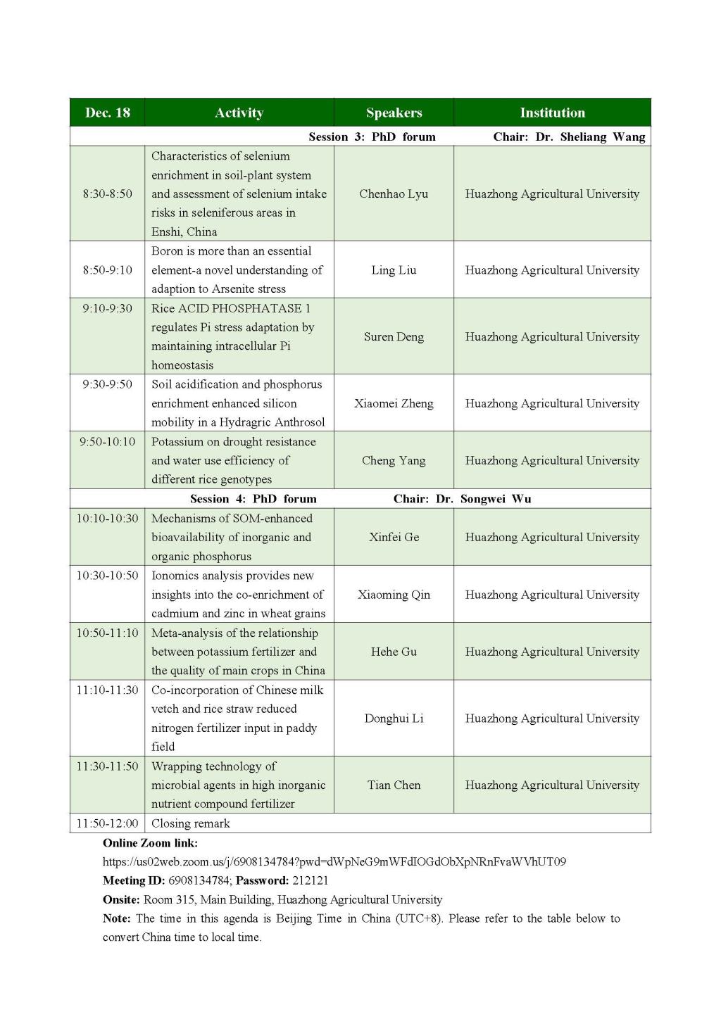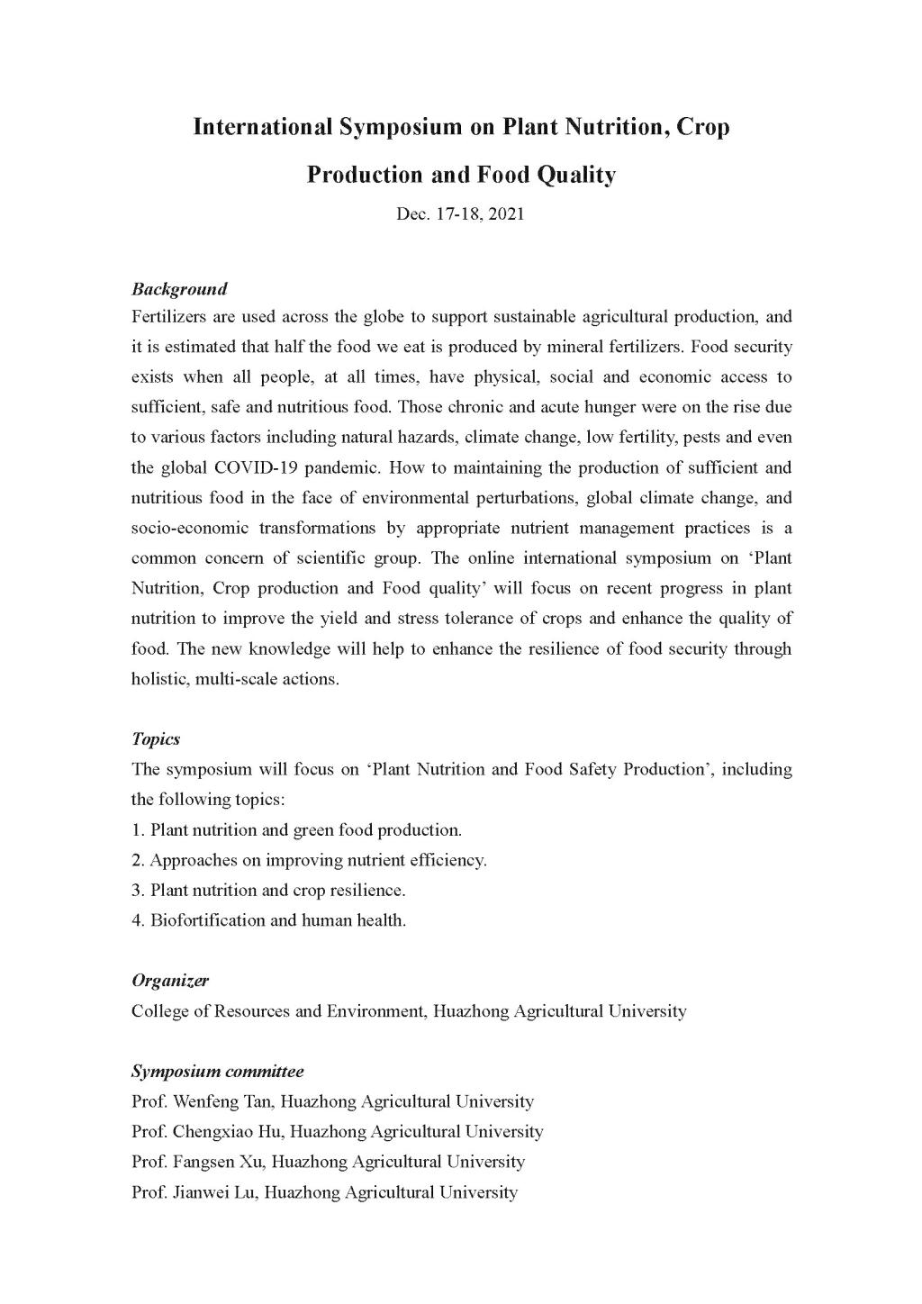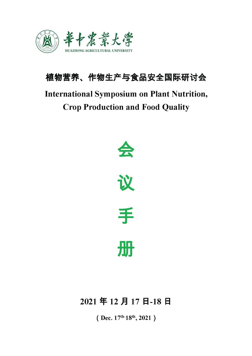 植物营养、作物生产与食品安全国际研讨会会议手册