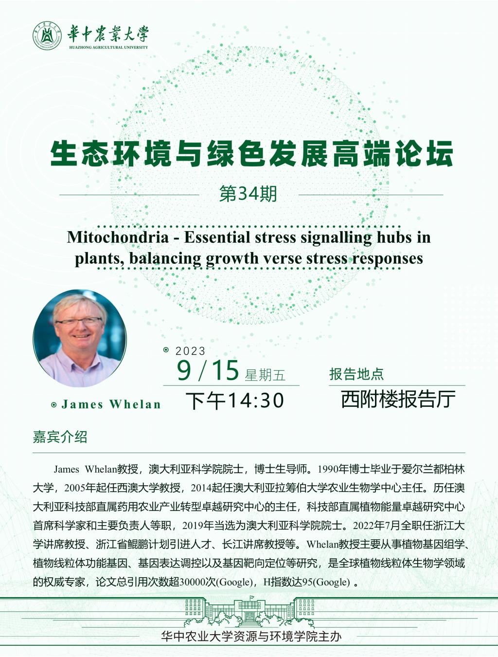 【高端论坛】34期:Mitochondria - Essential stress signalling hubs in plants, balancing growth verse stress responses